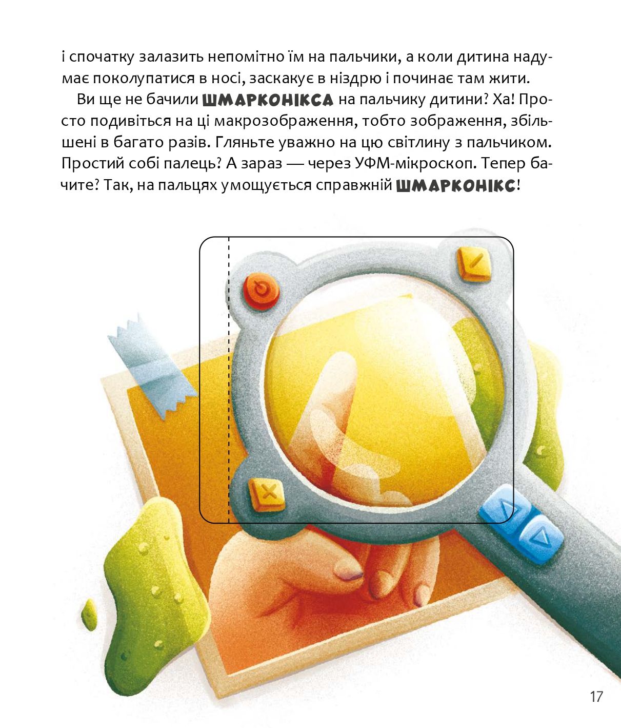 Шмарконикс любит носики, в которых часто ковыряются пальчиками. Именно он скребает их изнутри, когда делает свою утреннюю зарядку.