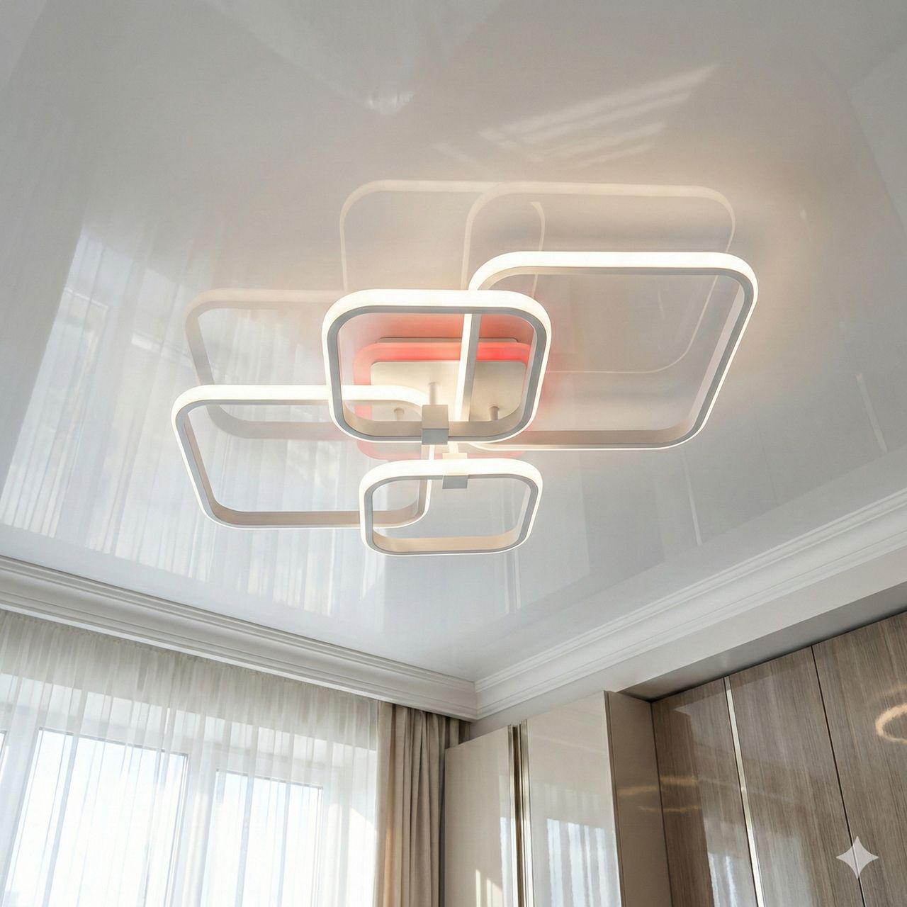 Светодиодная люстра Геометрическая 85W с пультом и подсветкой, Белая (44х55 см)Современное высокотехнологичное решение для основного освещения залов, гостиных и спален площадью до 20 м². Благодаря мощному световому потоку 4675 Лм и возможности тонкой настройки яркости через пульт, люстра создает комфортную световую среду, становясь центральным арт-объектом вашего интерьера.Визуальный анализ и дизайнЛюстра выполнена в актуальном стиле футуристичного минимализма. Конструкция состоит из четырех полых квадратов с мягко закругленными углами, которые пересекаются друг с другом, создавая эффектную симметричную композицию. Белоснежный матовый корпус из металла выглядит легко и воздушно на фоне потолка.Главная визуальная особенность модели — встроенная светодиодная подсветка основания (на фото представлена в мягком розово-красном спектре). Это создает дополнительный декоративный ореол на потолке, подчеркивая объем светильника. Качественные акриловые рассеиватели обеспечивают мягкую заливку светом без видимых точек светодиодов.Лучшие сценарии использованияБлагодаря высокой мощности (85 Вт) и интеллектуальному управлению, модель идеальна для:Для просторной гостиной или зала: Обеспечивает яркое заполняющее освещение, достаточное для приема гостей и отдыха.Для спальни: Режим диммирования позволяет превратить яркую люстру в мягкий ночник, а пульт обеспечит комфорт, не требуя вставать с кровати.Для современных студий: Геометрическая форма помогает визуально зонировать открытое пространство.Почему эта модель решает ваши задачиХарактеристикаВаша проблема или сомнениеКак это работает на практикеМощность 85 ВтБоязнь, что одного светильника не хватит на большую комнату.Световой поток 4675 Лм уверенно освещает площадь до 20 м², заменяя пять ламп накаливания по 100 Вт.Пульт и диммерТрудно подобрать комфортную яркость для разного времени суток.Вы плавно меняете яркость от 10% до 100% и температуру света одним нажатием кнопки.RGB-подсветка основанияОбычные белые люстры выглядят слишком стандартно.Дополнительный цветовой контур создает эффект "парящего" светильника и добавляет интерьеру уникальности.Высота 11 смКрупные люстры часто мешают в комнатах со стандартными потолками.Компактная высота позволяет люстре выглядеть объемно, не перегружая пространство.Технические характеристикиПараметрЗначениеТип светильникаПрипотолочная люстраРазмер (Д x Ш x В)55 x 44 x 11 смРазмер основания18 x 18 смРабочее напряжение220 В (стандартная сеть)Мощность85 ВтСветовой поток4675 ЛмПлощадь освещениядо 20 м²Температура света3200K (теплый), 4100K (нейтральный), 6500K (холодный)УправлениеПульт ДУ + настенный выключательФункция памятиОтсутствует (сбрасывается при выключении)ОснащениеЦветная LED-подсветка основания, диммерМатериал корпусаМеталл (Белый)Материал плафонаАкрилЗащита от влагиIP20 (только для сухих комнат)Тип крепленияМонтажная планка (длина 11 см)Вес1.51 кгГарантия12 месяцевСоветы по установкеОсобенности сборки: Люстра поставляется в разобранном виде для обеспечения максимальной сохранности при транспортировке. Обратите внимание: все световые квадраты уже полностью подключены к внутренней электрической сети. Вам необходимо только механически прикрутить квадраты к основанию люстры перед монтажом на потолок.Для натяжных потолков: Металлическое основан