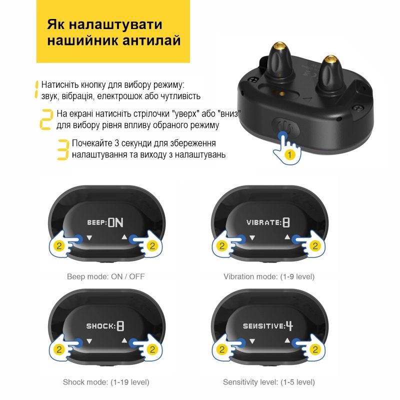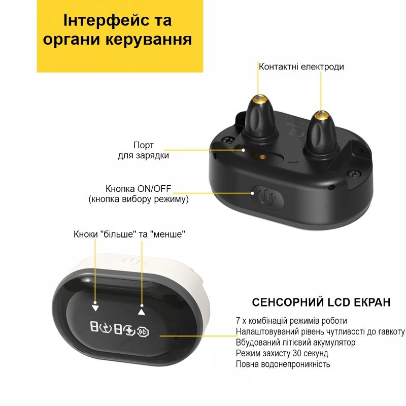 Отличительной особенностью данной модели является сенсорный экран и возможность детально настроить режим работы, виды воздействия, включение и отключение каждого из вида воздействий (электрошок, вибрация и звук), настройка силы воздействия электрошоком от 1 до 19 и вибрации от 1 до 9 а так же чувствительность к громкости лая от 1 до 5 уровней.