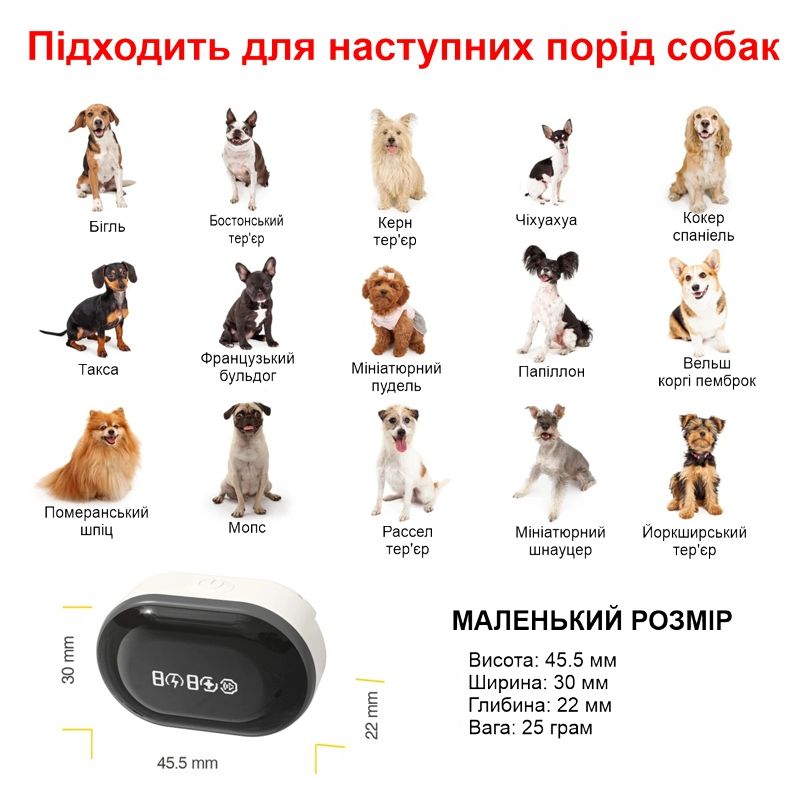 - Разработан специально для маленьких собак, имеет маленькие размеры, всего 45,5х30х22 мм и вес всего 25 грамм.