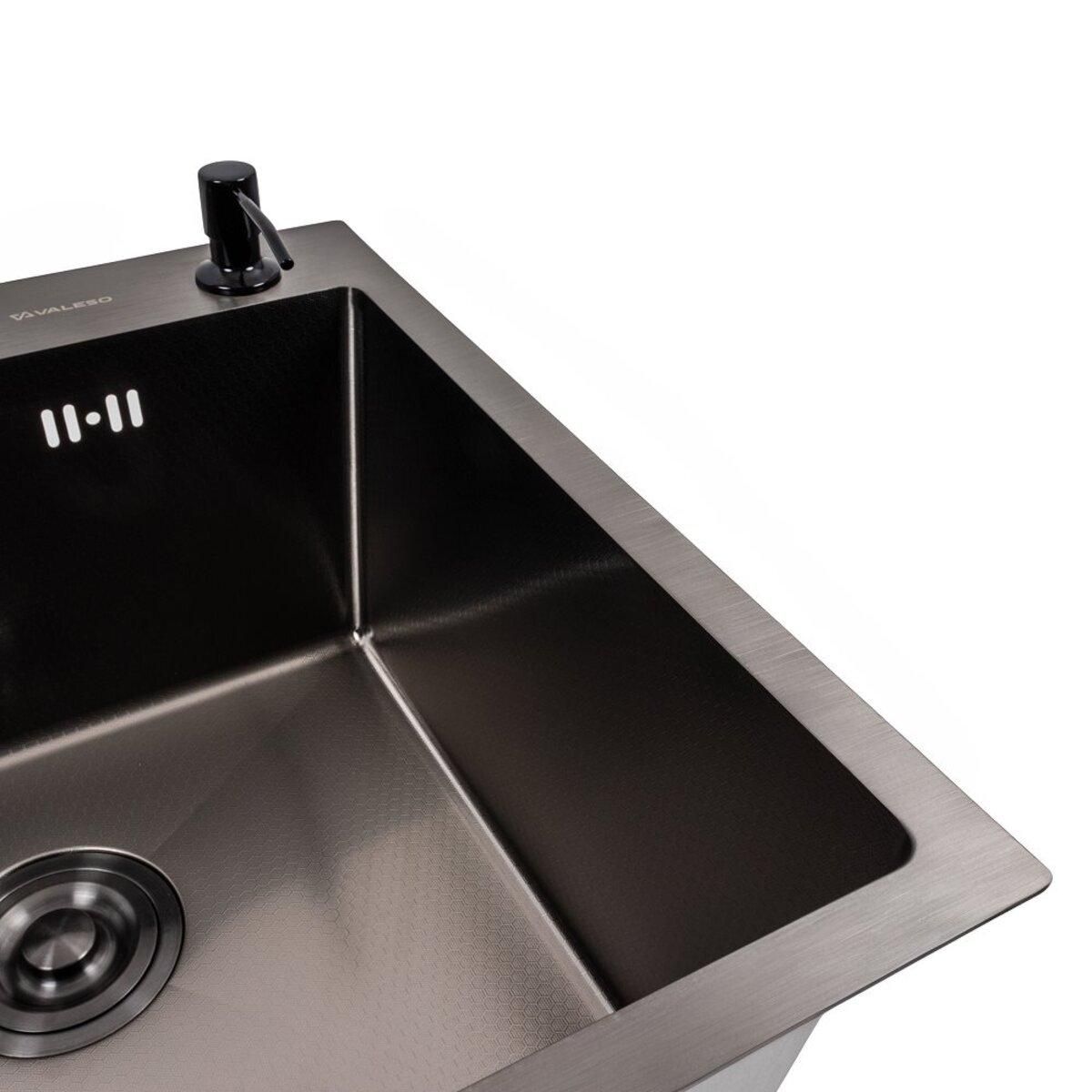 Кухонная мойка VALESO Handmade: Выполнена из прочной нержавеющей стали SUS 201 со специальным защитным покрытием PVD DECOR. Такое покрытие эффективно защищает поверхность от царапин, потемнения и известкового налета. Благодаря толщине стали 3.0 мм на верхней панели и 0.8 мм в чаше, мойка отличается повышенной надежностью и устойчивостью к температурным перепадам.
