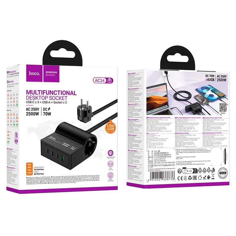 Сетевой удлинитель HOCO AC34 — это универсальное устройство для одновременного подключения бытовой техники и быстрой зарядки современных гаджетов. Модель сочетает мощные розетки переменного тока и высокопроизводительные USB-порты с поддержкой протоколов быстрой зарядки, что делает её удобным решением для дома, офиса, рабочего стола или поездок.