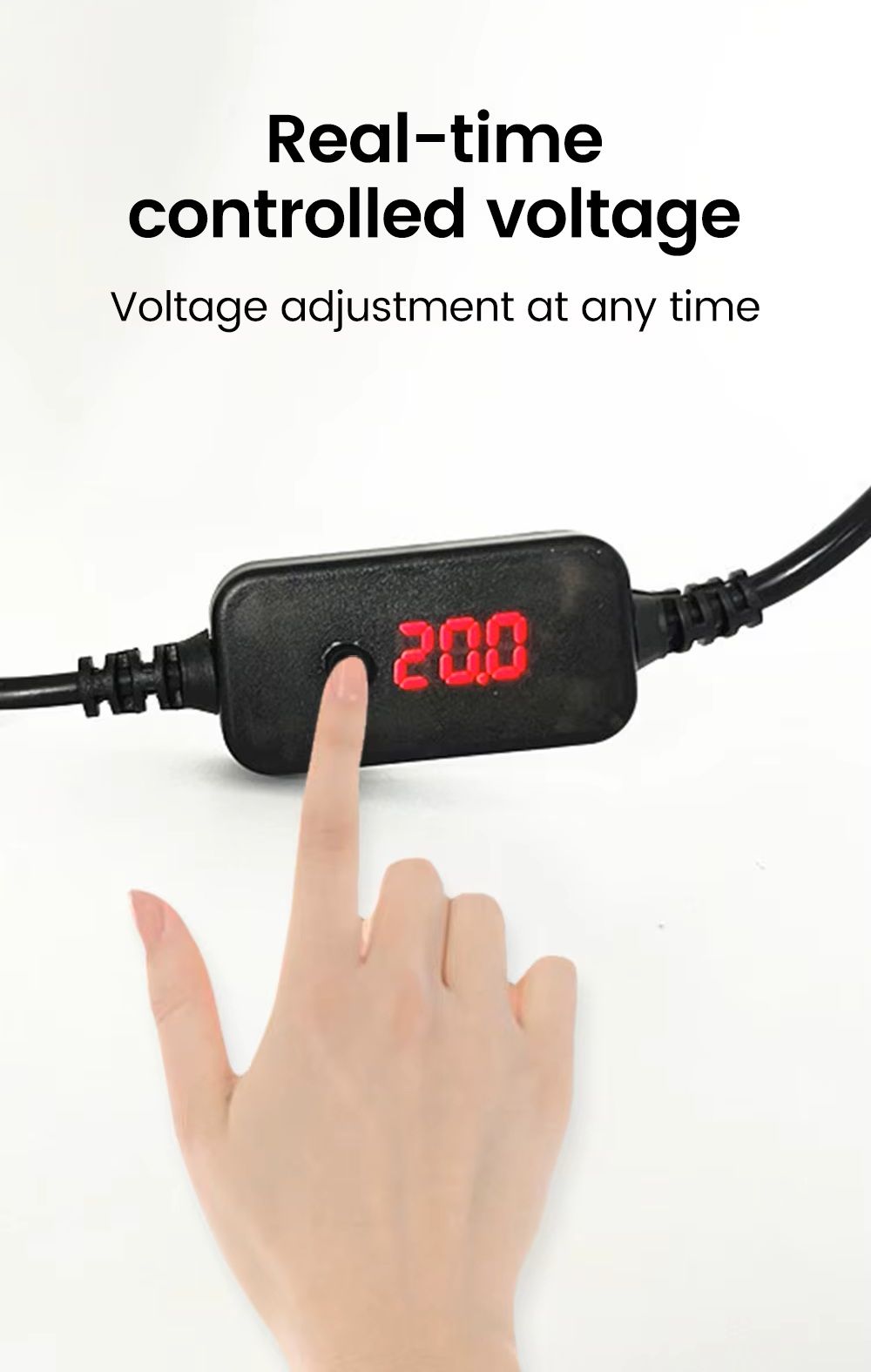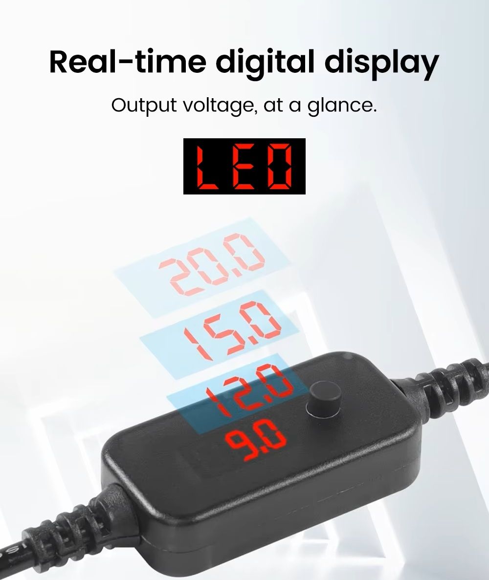 - Кнопка на корпусе кабеля позволяет быстро менять выходное напряжение и адаптировать питание под разные устройства, а цифровой индикатор показывает текущие параметры.