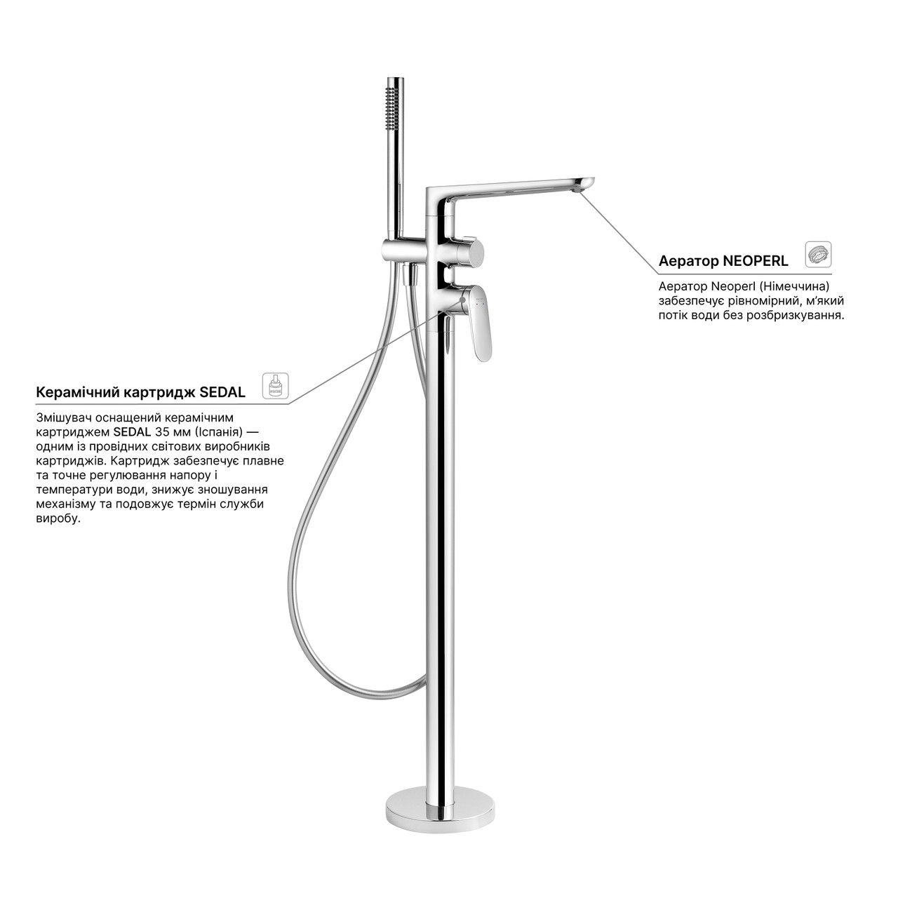 Додаткові характеристикиКорпус з латуні Н59. Картридж SEDAL - Іспанія. Аератор Neoperl - Німеччина.