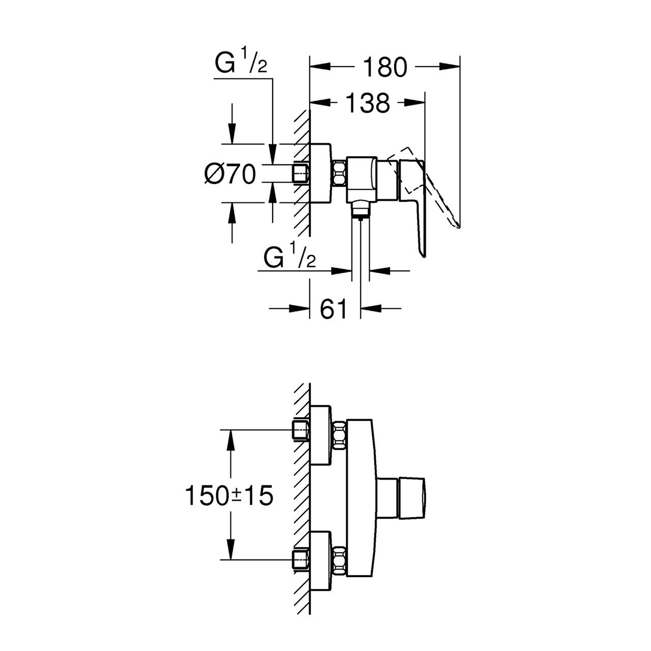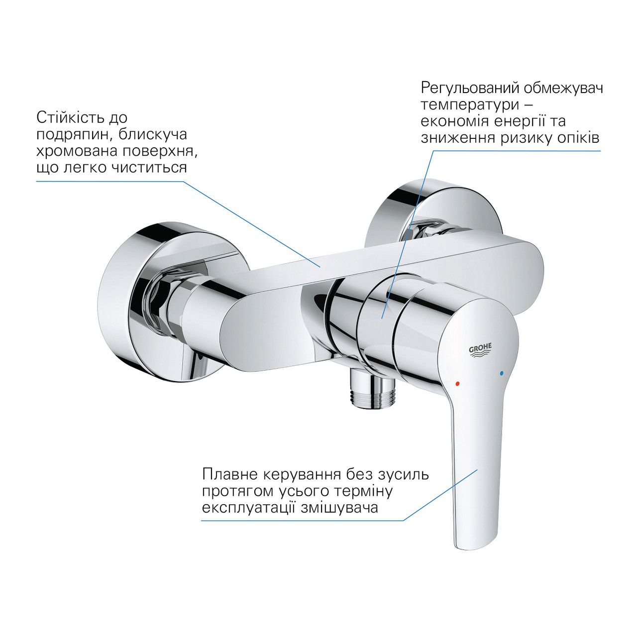Додаткові характеристикиРегулювання витрати води. Відведення для душу знизу 1/2". Додатковий обмежувач температури.