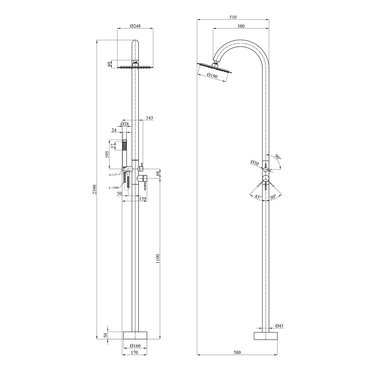 Висота душової стійки, мм2390