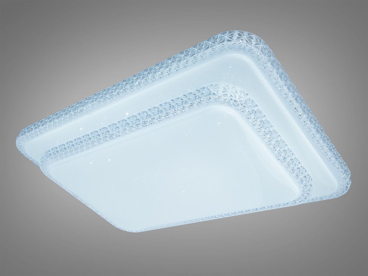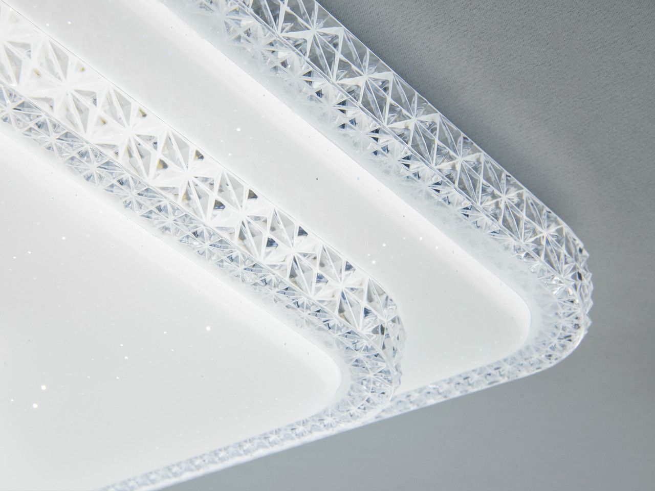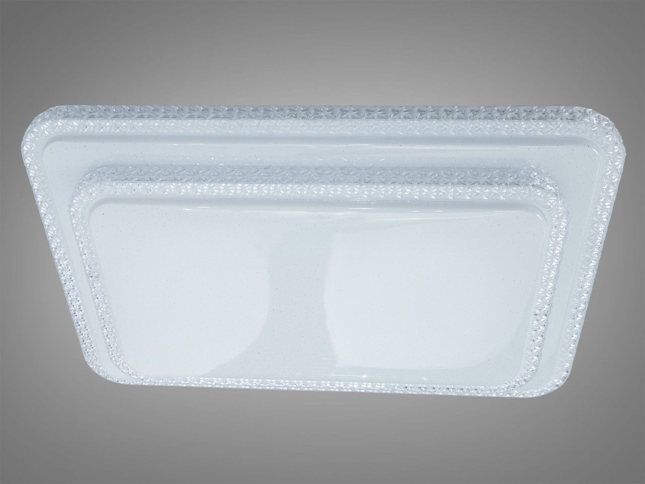 Светильник выполнен в форме двух вложенных прямоугольных контуров с лаконичной геометрией. Металлический каркас покрыт качественной белой эмалью, что делает прибор визуально невесомым на фоне светлого потолка. Основной деталью является акриловый рассеиватель с фактурным точечным напылением (эффект "звездного неба"), который мягко преломляет световой поток, создавая деликатные блики. Припотолочное крепление (высота всего 10 см) позволяет использовать люстру в помещениях с любой высотой потолка, сохраняя эргономику пространства.