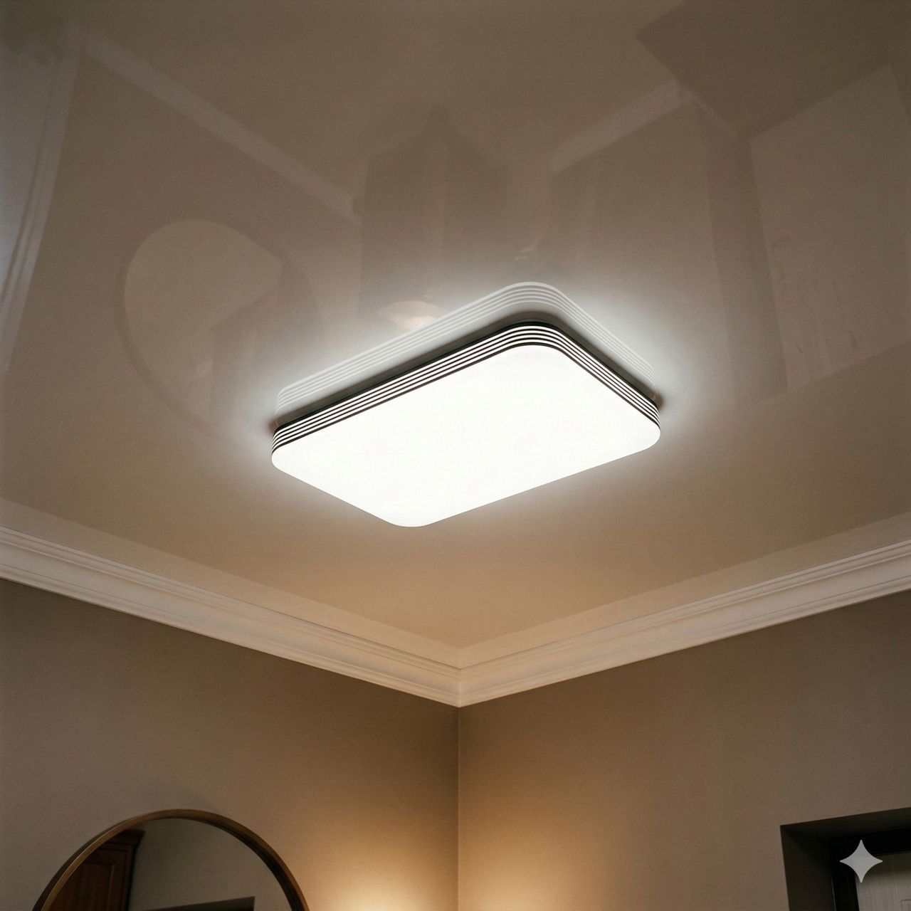 Светильник выполнен в форме прямоугольной панели с минимальной высотой корпуса — всего 6 см. Основание окрашено в универсальный белый цвет, а по периметру расположена тонкая серебристая линия, добавляющая прибору современный акцент. Главной особенностью является акриловый рассеиватель с эффектом «звездного неба» (мелкая световая перфорация). При включении панель излучает равномерный мягкий свет, а микроогранка создает деликатное мерцание, что делает потолок визуально выше и объемнее.