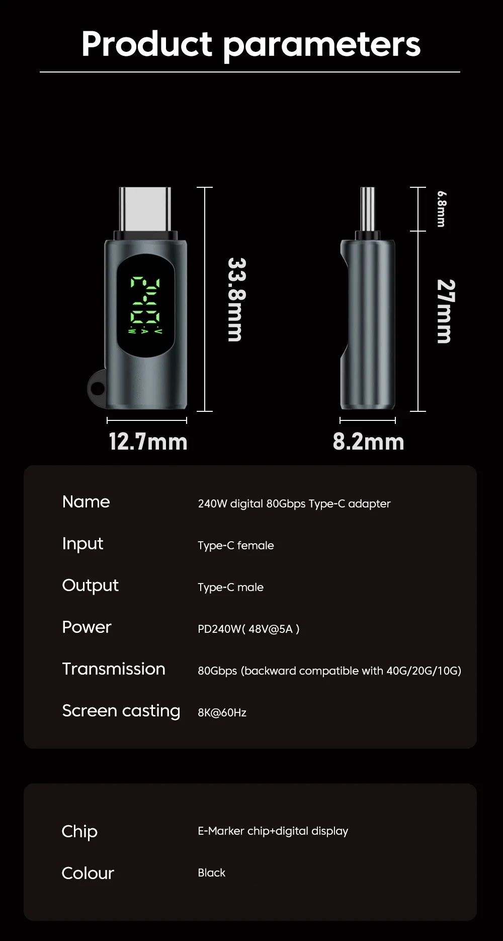 Это компактный переходник формата Type-C “папа” → Type-C “мама”, предназначенный для зарядки, передачи данных и подключения внешних мониторов. Устройство оснащено встроенным цифровым дисплеем, который отображает мощность зарядки в реальном времени, позволяя контролировать процесс питания устройства.