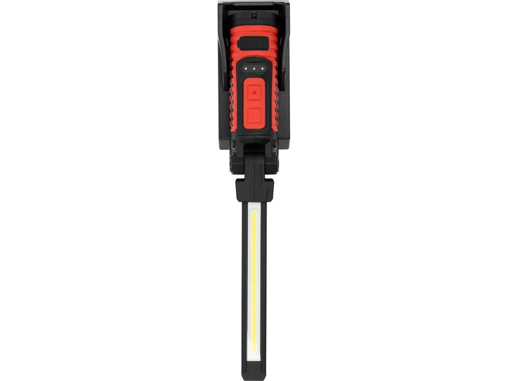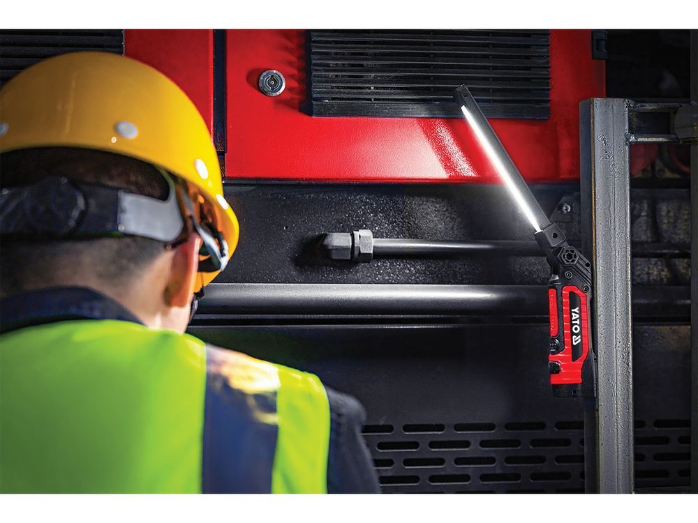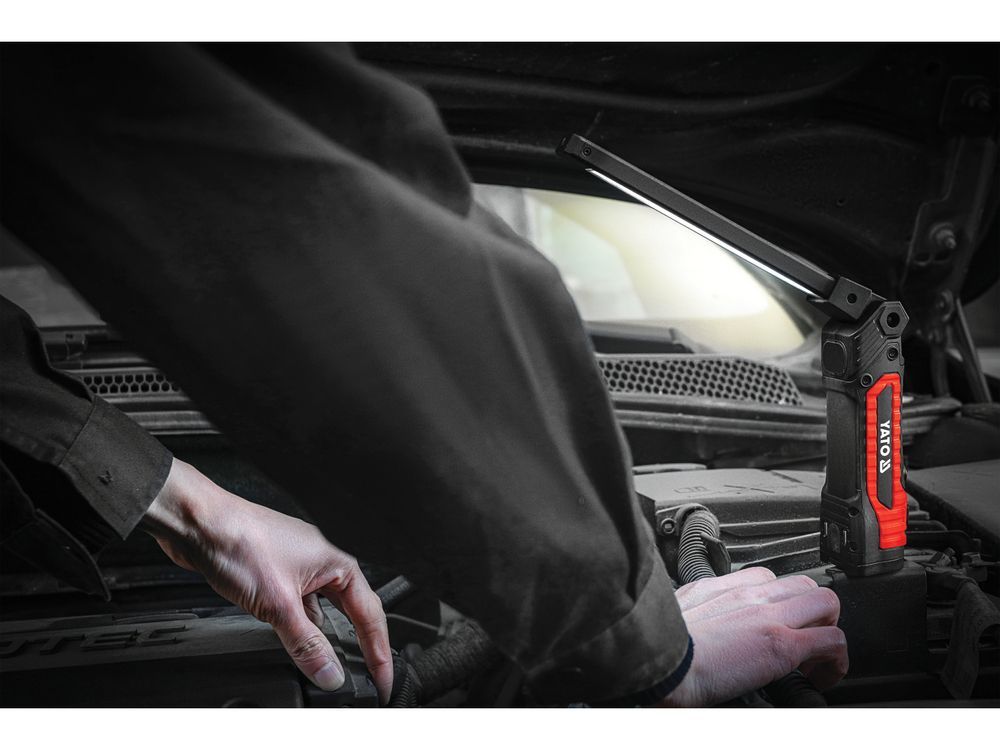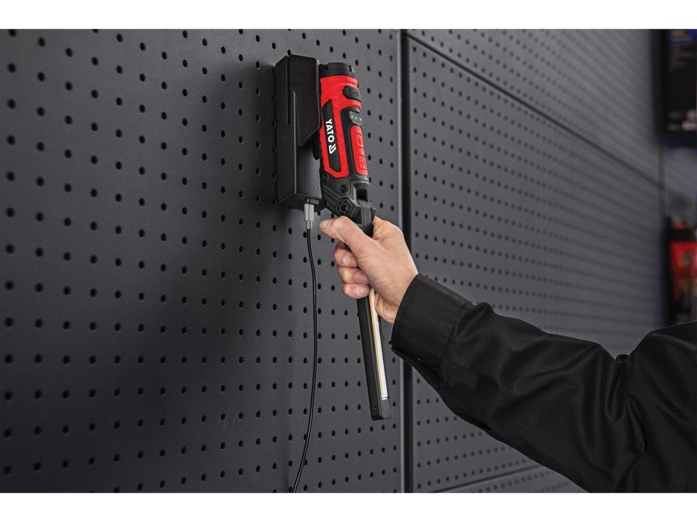 Адаптированный для мастерской корпус оснащен монтажными магнитами и поворотным крючком, что позволяет стабильно размещать или подвешивать фонарь, не занимая рук.
