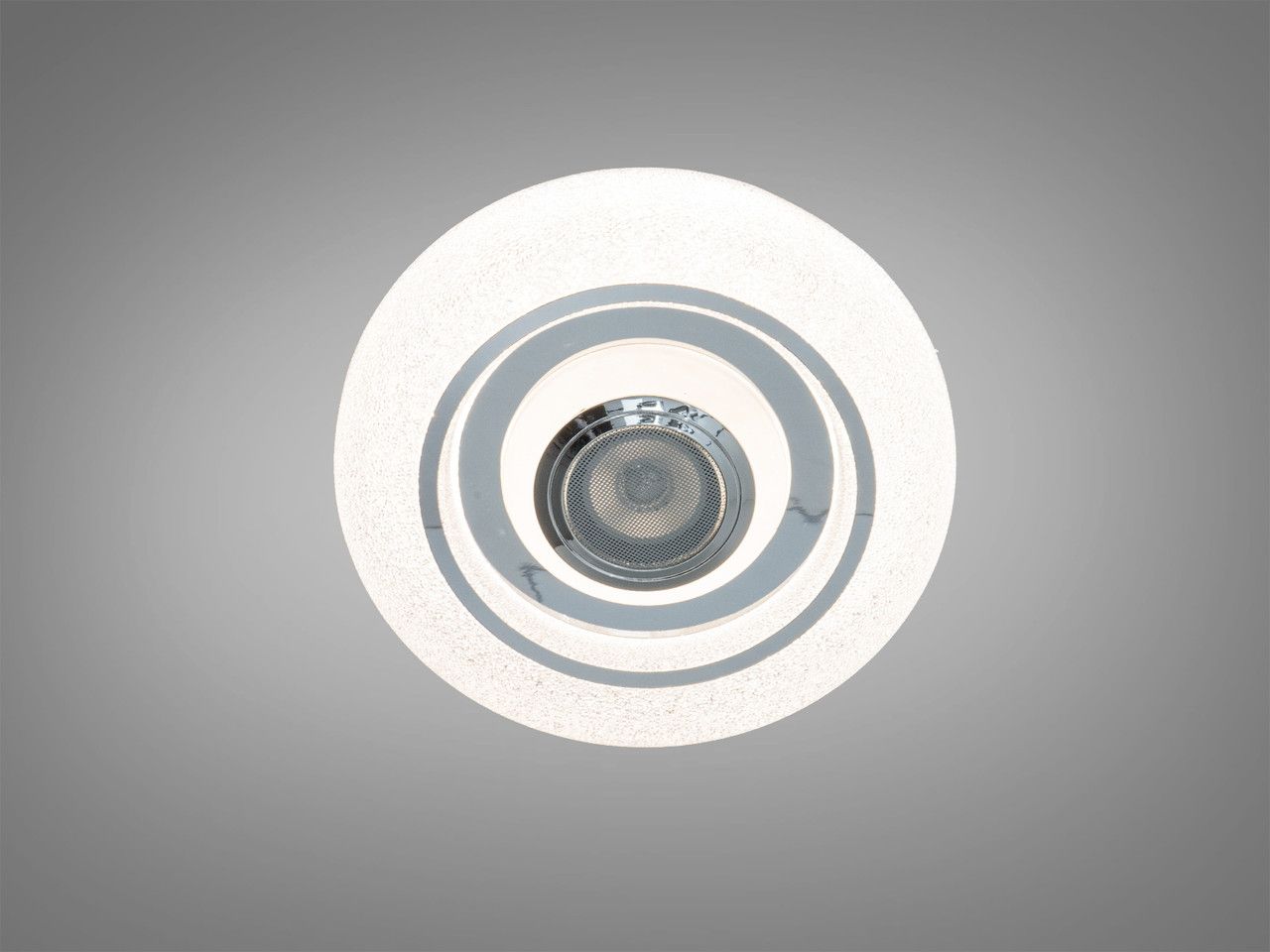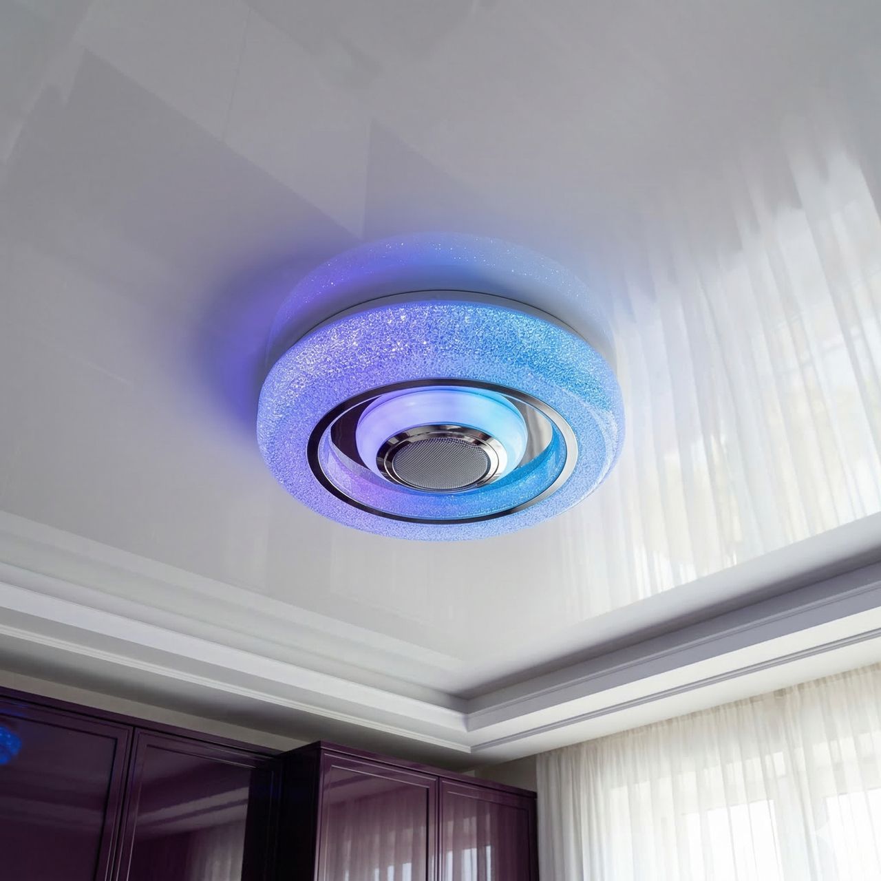 Люстра имеет современную круглую форму с акриловым рассеивателем, украшенным микроперфорацией (эффект «звездного неба»). При включении плафон деликатно мерцает, создавая ощущение волшебства. В центре расположена стильная хромированная решетка встроенного динамика. Благодаря компактным размерам (диаметр 29 см) и небольшой высоте (7 см), люстра смотрится лаконично и не загромождает пространство, что важно для активных игр в детской.