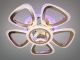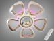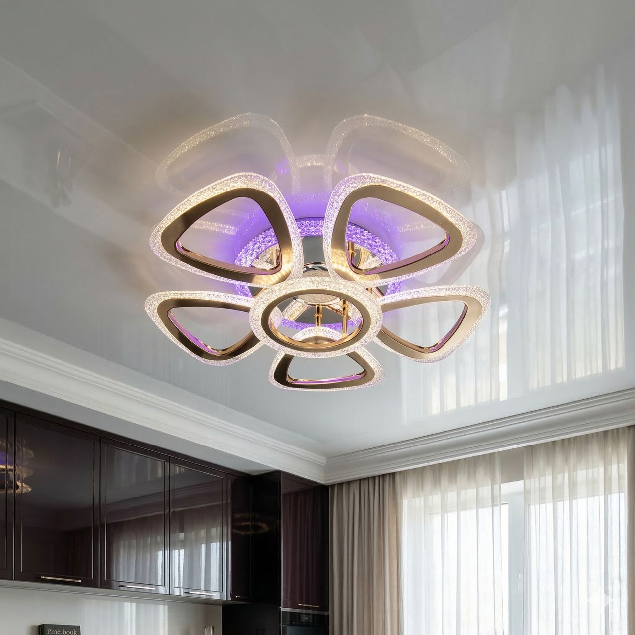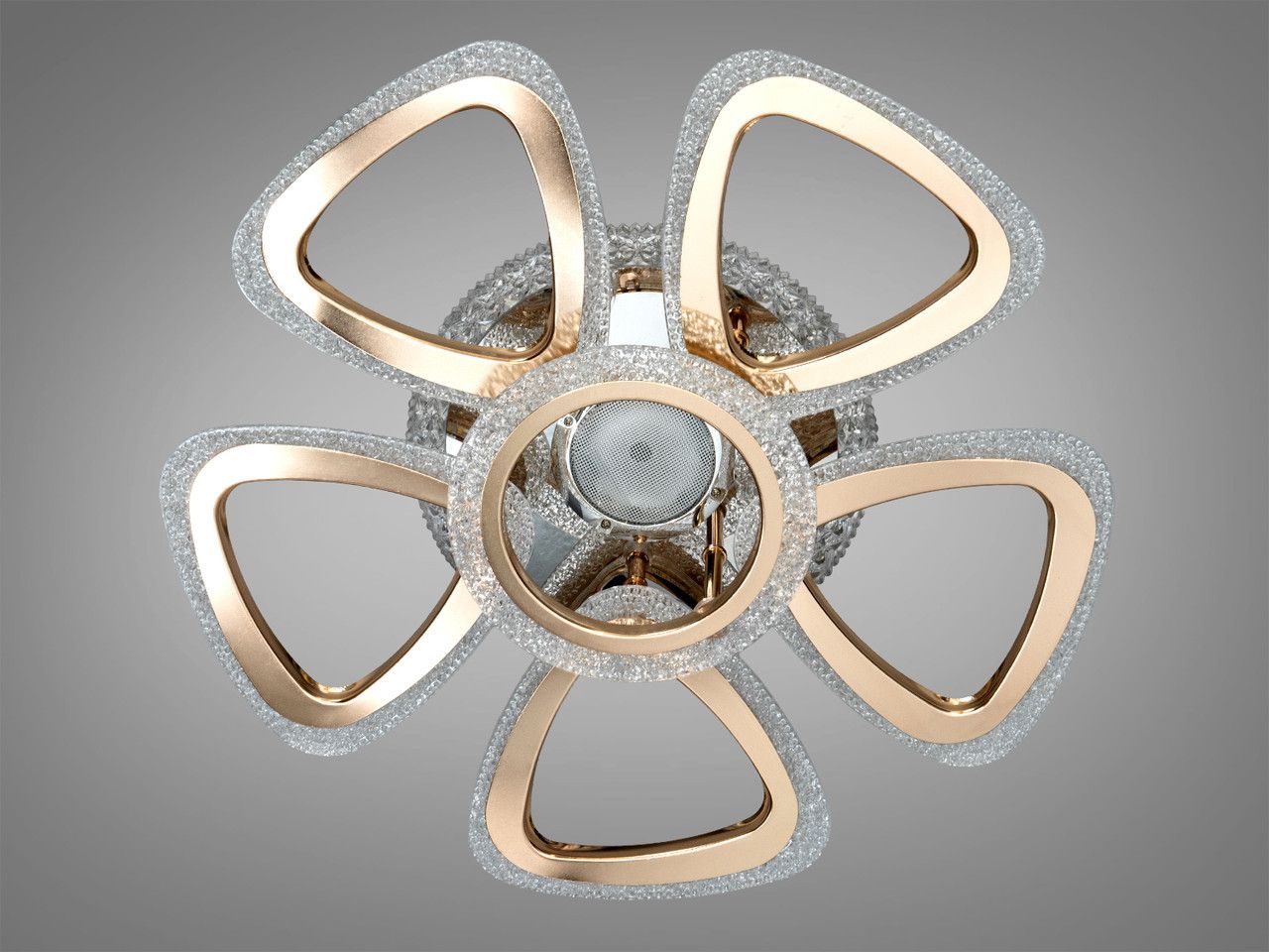 Люстра выполнена в форме пяти симметричных лепестков, окружающих центральный модуль с динамиком. Дизайн построен на премиальном сочетании зеркального хрома и благородного золота (гальваническое покрытие). Главной особенностью являются рассеиватели из прозрачного акрила с внутренней фактурой «колотый лед», которая при включении создает эффект искрящегося хрусталя. В основание встроена дополнительная подсветка, работающая в трех фиксированных режимах: насыщенный синий, энергичный красный и нежный сиреневый.