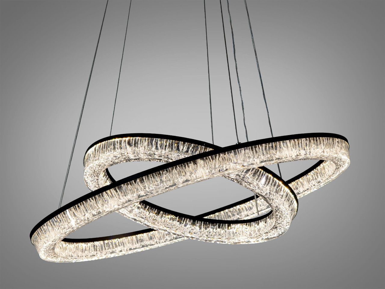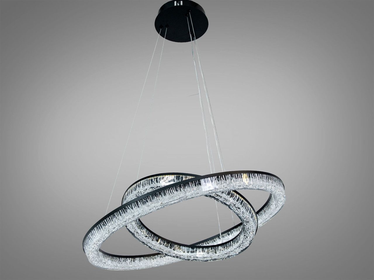 Виразне архітектурне рішення для сучасного освітлення. Поєднання двох переплетених кілець із глибоким чорним матовим покриттям та іскристим розсіювачем створює ефект динамічного об'єму, перетворюючи люстру на головний арт-об'єкт вашого інтер'єру.