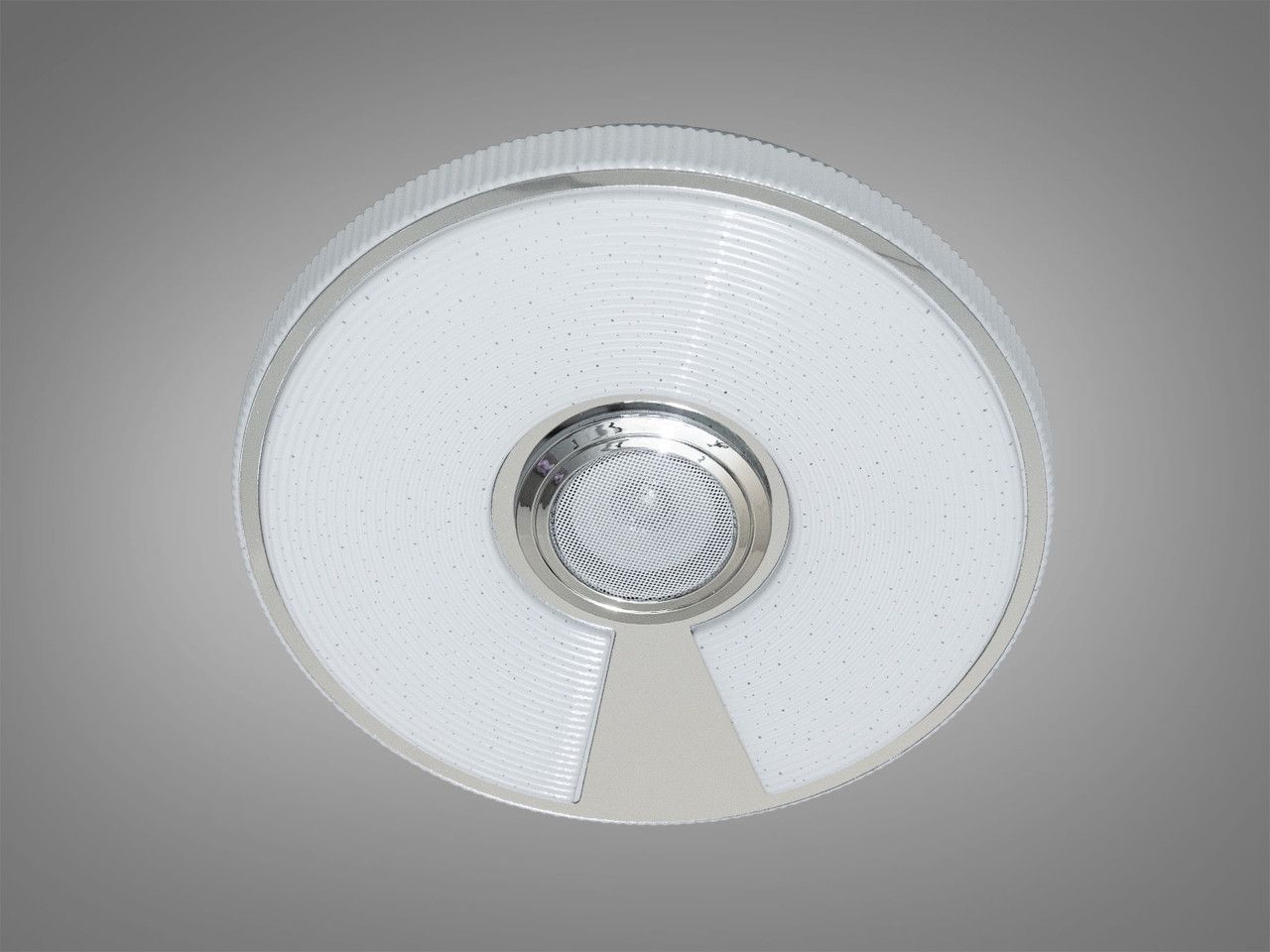 Люстра имеет современную круглую форму с изящным акриловым плафоном. Благодаря специальной микроперфорации («эффект звездного неба»), при включении рассеиватель деликатно мерцает, имитируя созвездия. В самом центре расположена стильная металлическая решетка, под которой скрыт динамик. Компактная высота (всего 6 см) делает прибор идеальным для детских комнат, не загромождая пространство и оставаясь недосягаемым для активных игр.