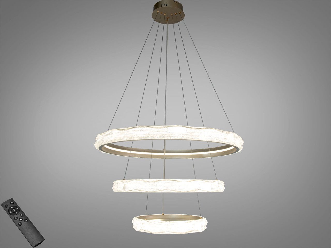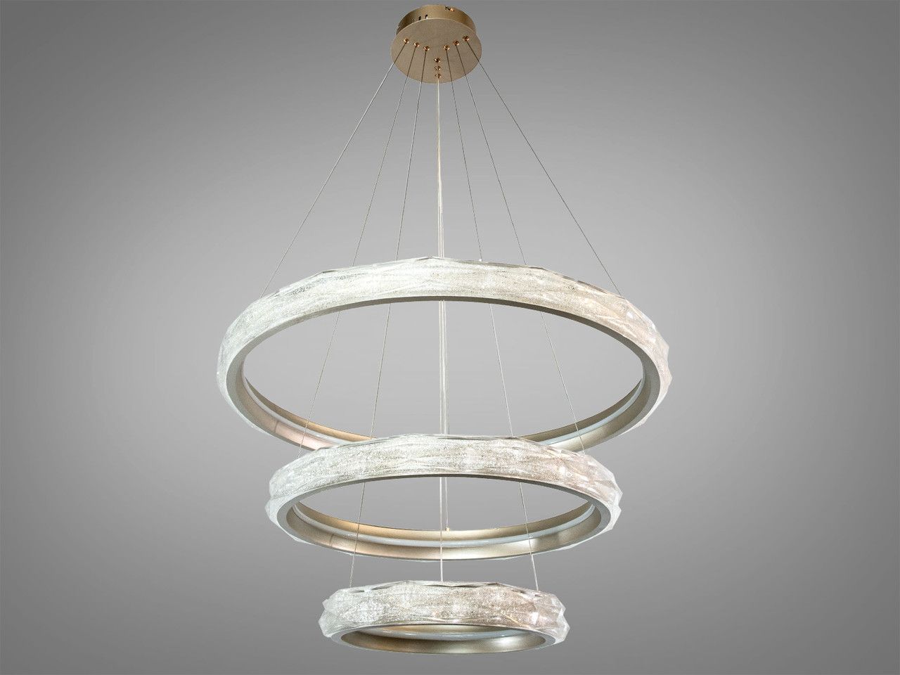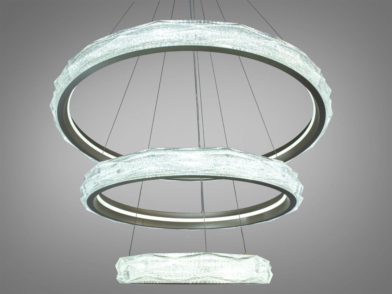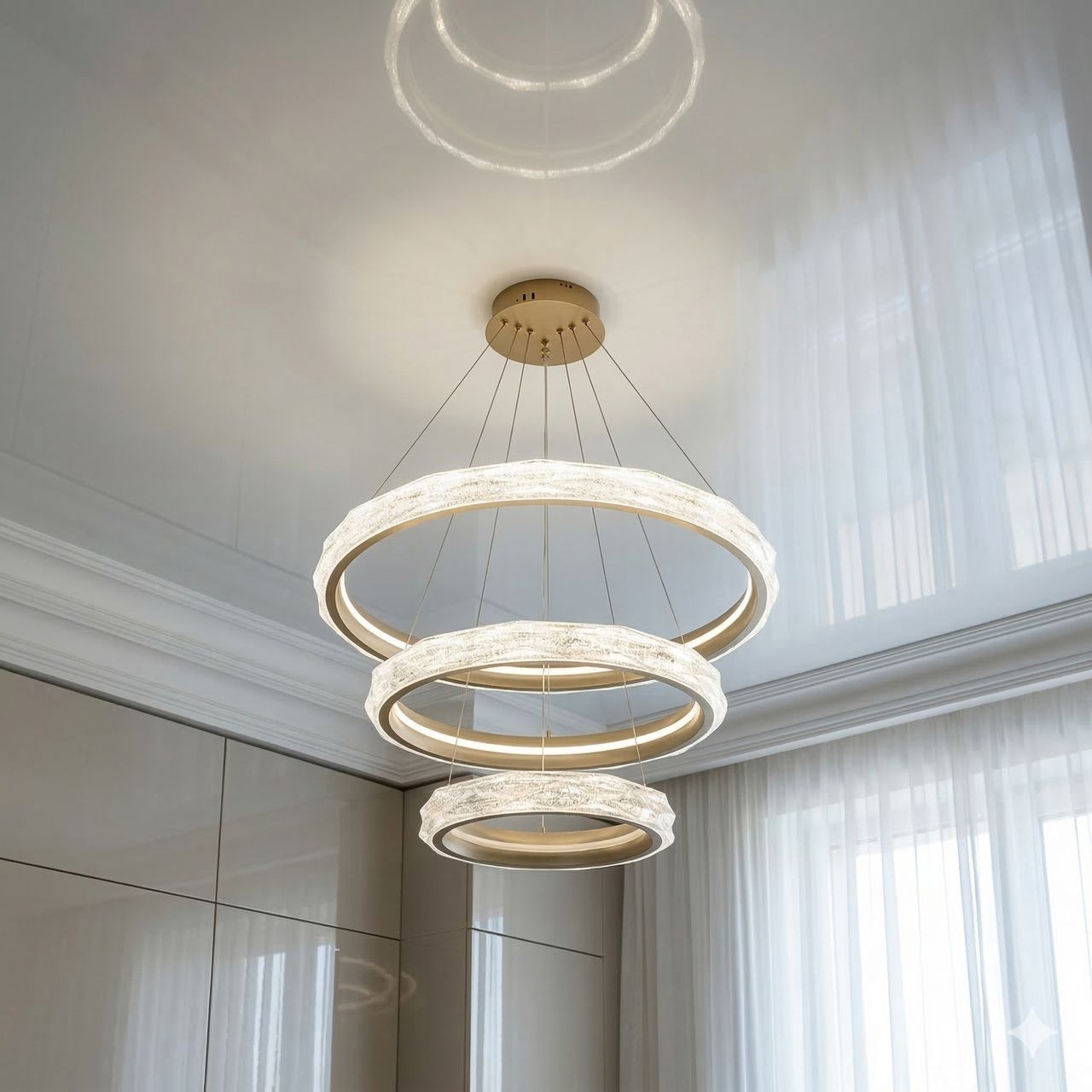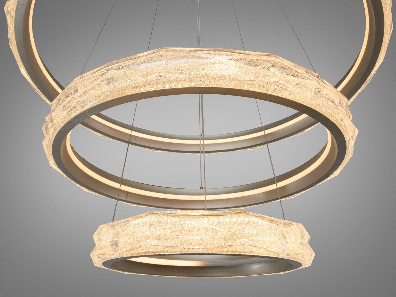 Дизайн люстры основан на трехъярусной композиции концентрических кругов диаметром 80, 60 и 40 см. Металлический каркас покрыт качественной золотой гальваникой, которая создает идеальную зеркальную поверхность. Главной особенностью являются массивные акриловые рассеиватели с внутренней кристаллической фактурой (эффект «колотого льда»). При включении рекордный световой поток в 13 750 люмен многократно преломляется в гранях акрила, создавая эффект россыпи миллионов бриллиантов в роскошном золотом обрамлении.