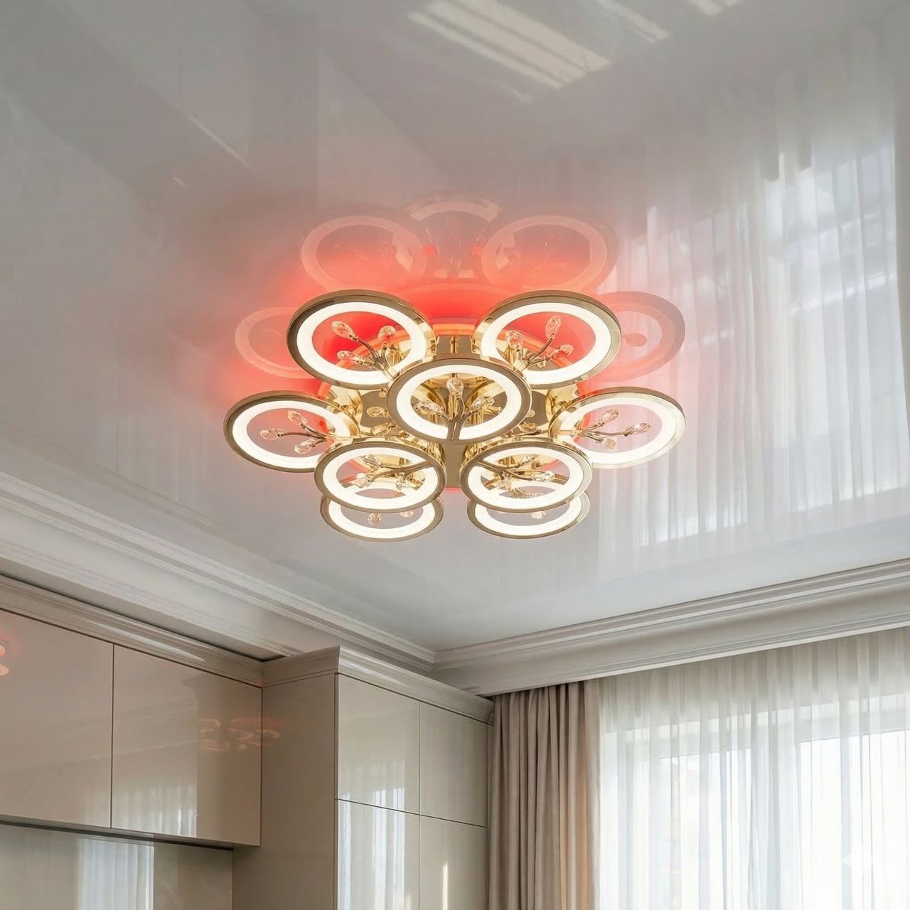 Эффектная и статусная световая инсталляция, сочетающая строгую геометрию колец и ювелирную изысканность кристаллического декора. Модель мощностью 140W разработана для основного освещения залов и гостиных площадью до 25 м², создавая роскошную атмосферу в золотых тонах.