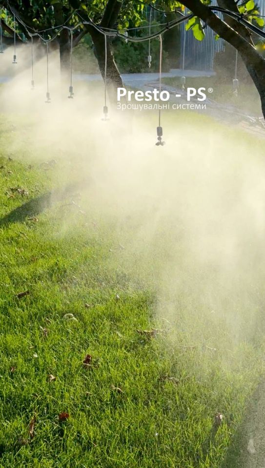 Підвісна установка з клапаном антидренажу Presto-PS та мікроджетом Туман (40301-S) використовується зі сліпою трубкою діаметром 16 і 20 мм або з трубкою для крапельниць діаметром 5 мм для побудови комбінованих систем крапельного поливу. Перевага та особливість крапельниці Туман - це можливість її використання для підкронового поливу рослин. Розпилення імітує дрібний туман і максимально наближене до природного зволоження ґрунту і повітря. Застосовується цей вид крапельниць для підвісного методу поливу на відкритому ґрунті або в теплицях, для зволоження повітря.