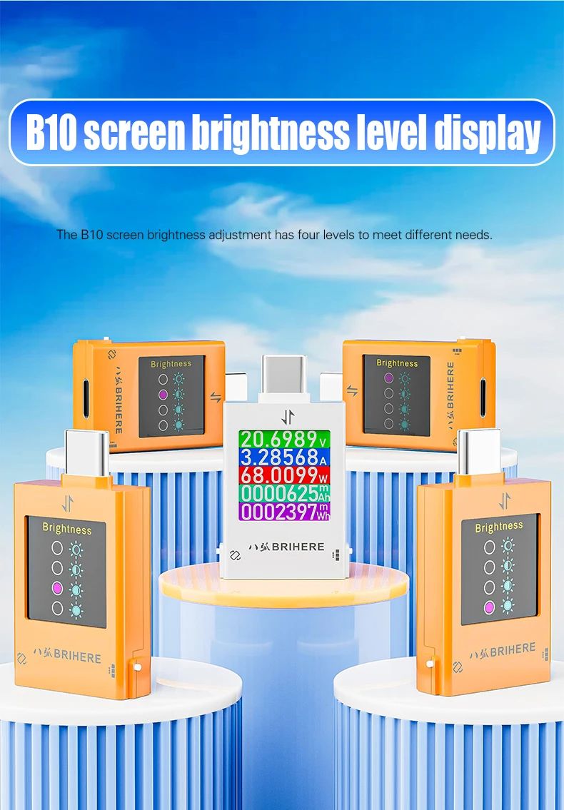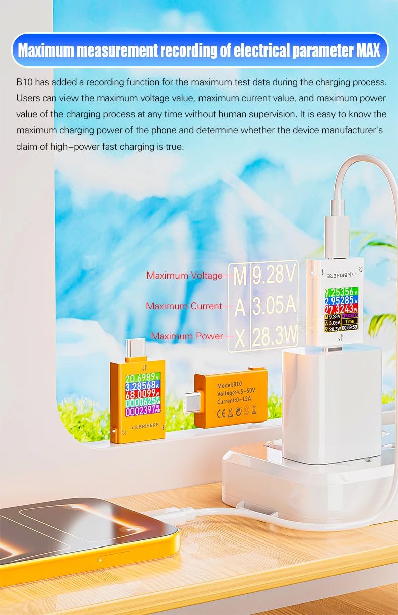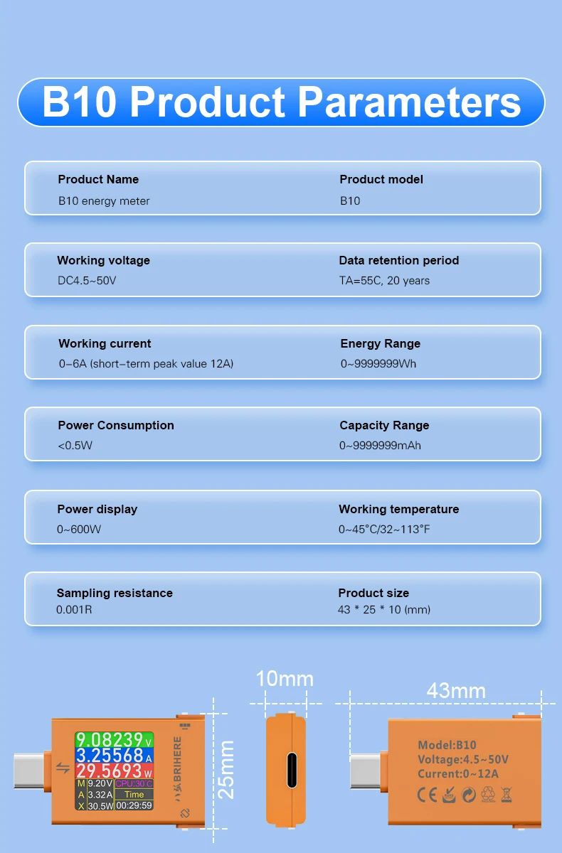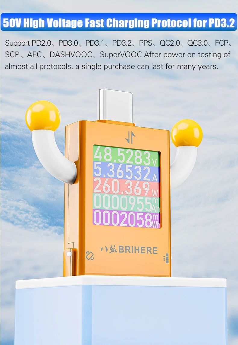 BRIHERE B10 — это профессиональный цифровой тестер питания с разъемами Type-C, предназначенный для точного измерения параметров зарядки и энергопотребления. Устройство поддерживает широкий диапазон напряжения и тока, а также современные протоколы быстрой зарядки, что делает его универсальным инструментом для диагностики зарядных устройств, кабелей, смартфонов, ноутбуков и других цифровых устройств.