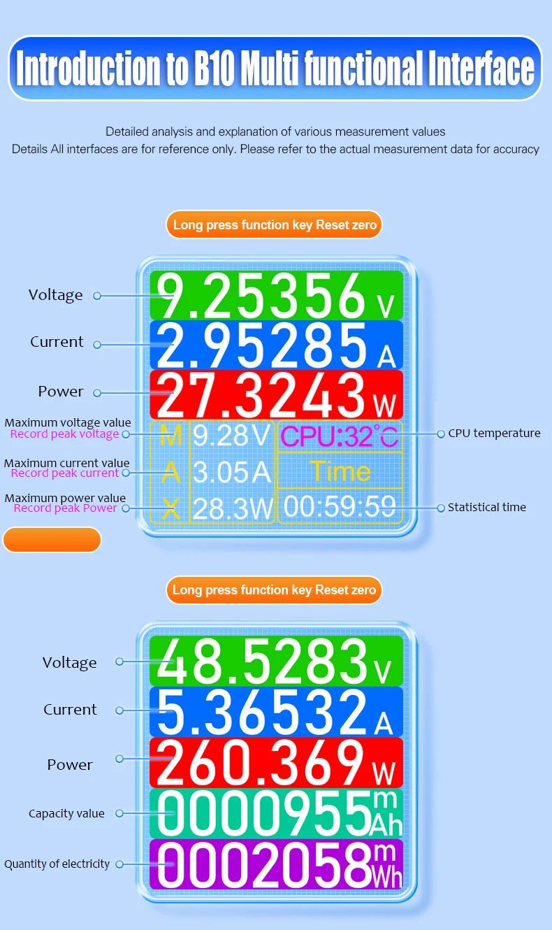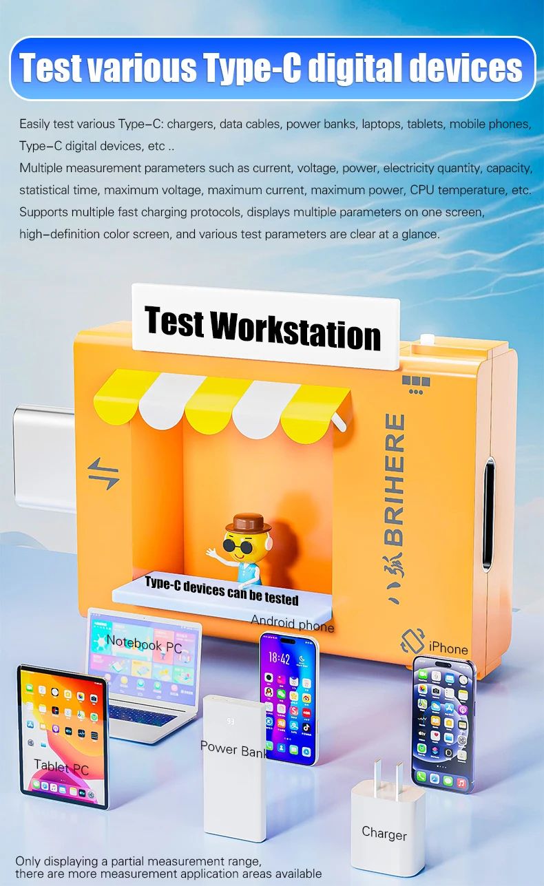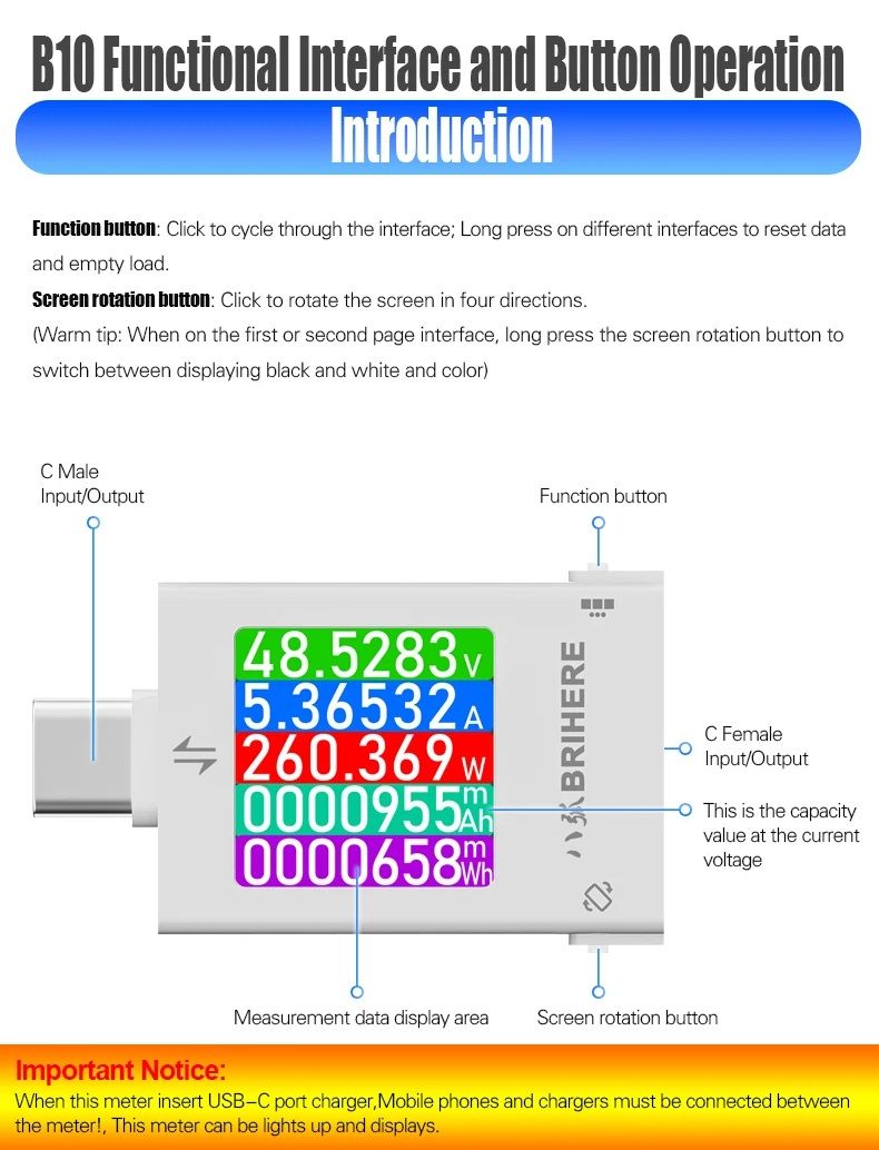 BRIHERE B10 — это профессиональный цифровой тестер питания с разъемами Type-C, предназначенный для точного измерения параметров зарядки и энергопотребления. Устройство поддерживает широкий диапазон напряжения и тока, а также современные протоколы быстрой зарядки, что делает его универсальным инструментом для диагностики зарядных устройств, кабелей, смартфонов, ноутбуков и других цифровых устройств.