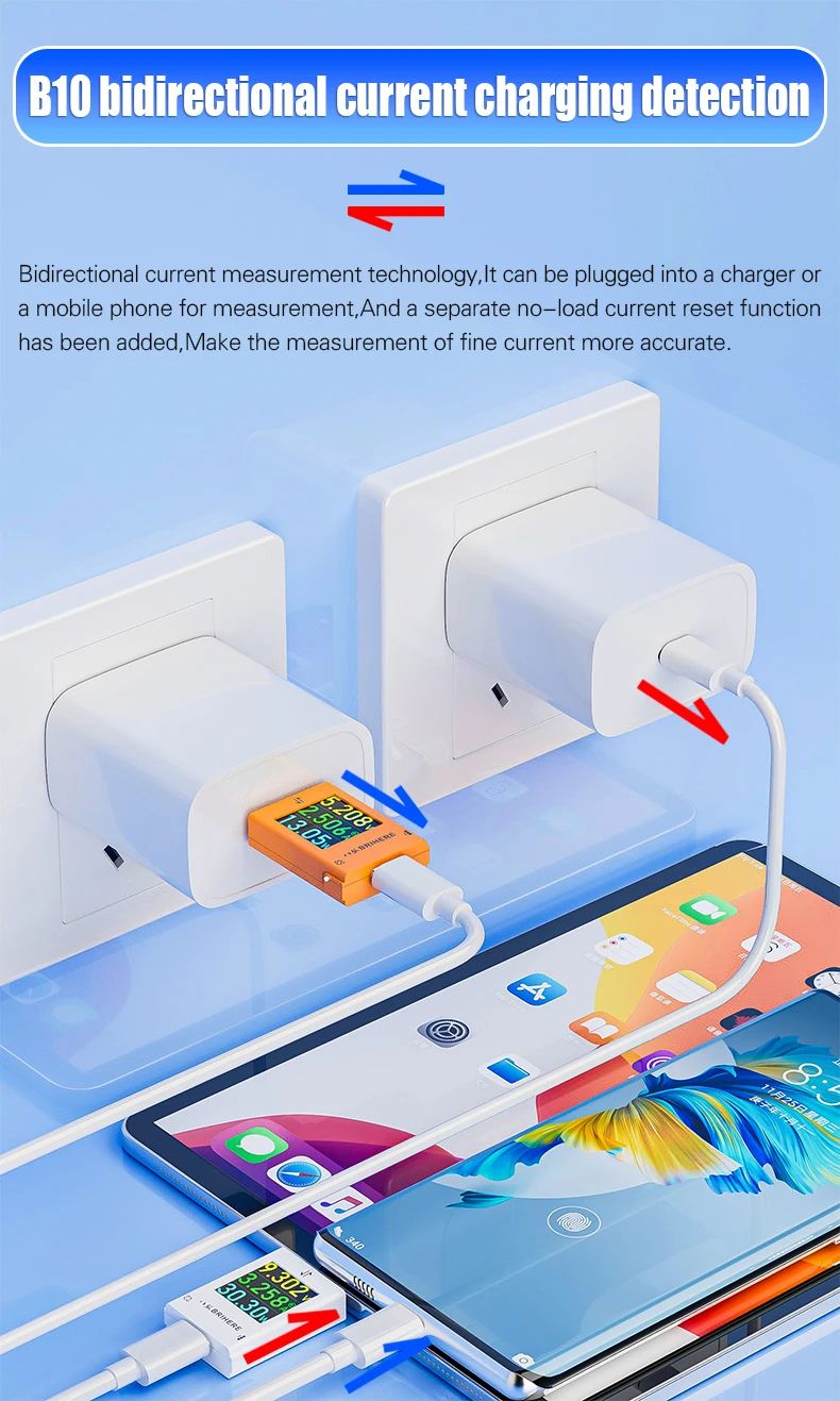 - Позволяет измерять ток как от зарядного устройства к устройству, так и в обратном направлении.