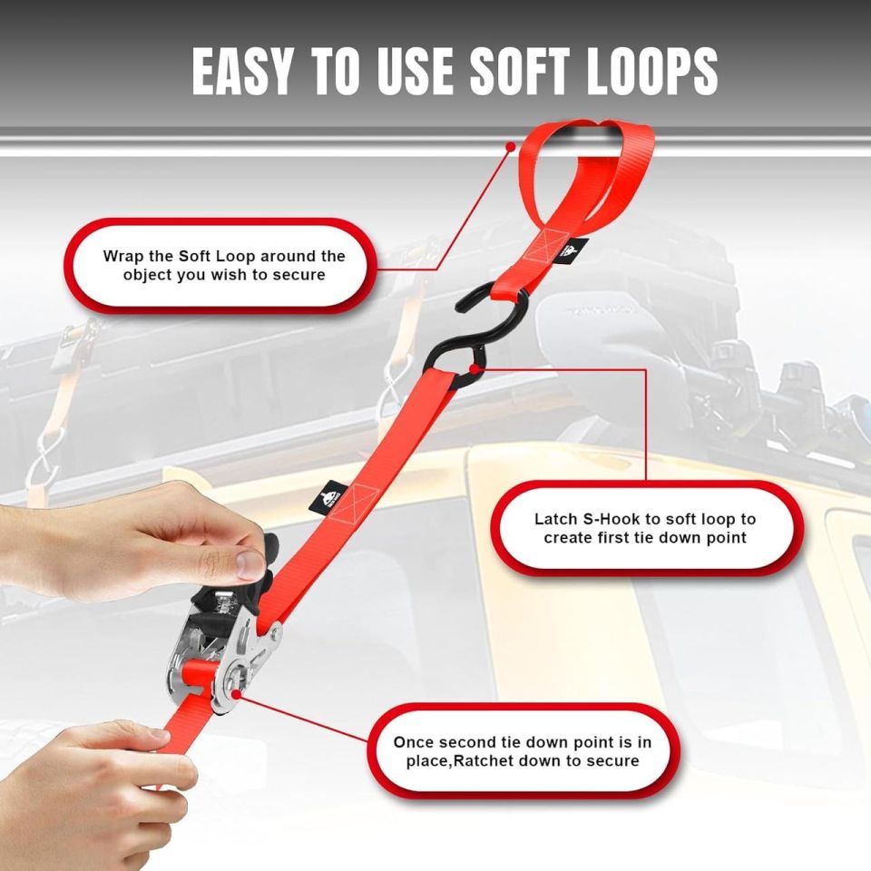 Набор стяжных ремней с храповым механизмом, S-крюками и защитными петлями (Soft Loops) 4 шт., 680 кг TORIN TRZD-RL