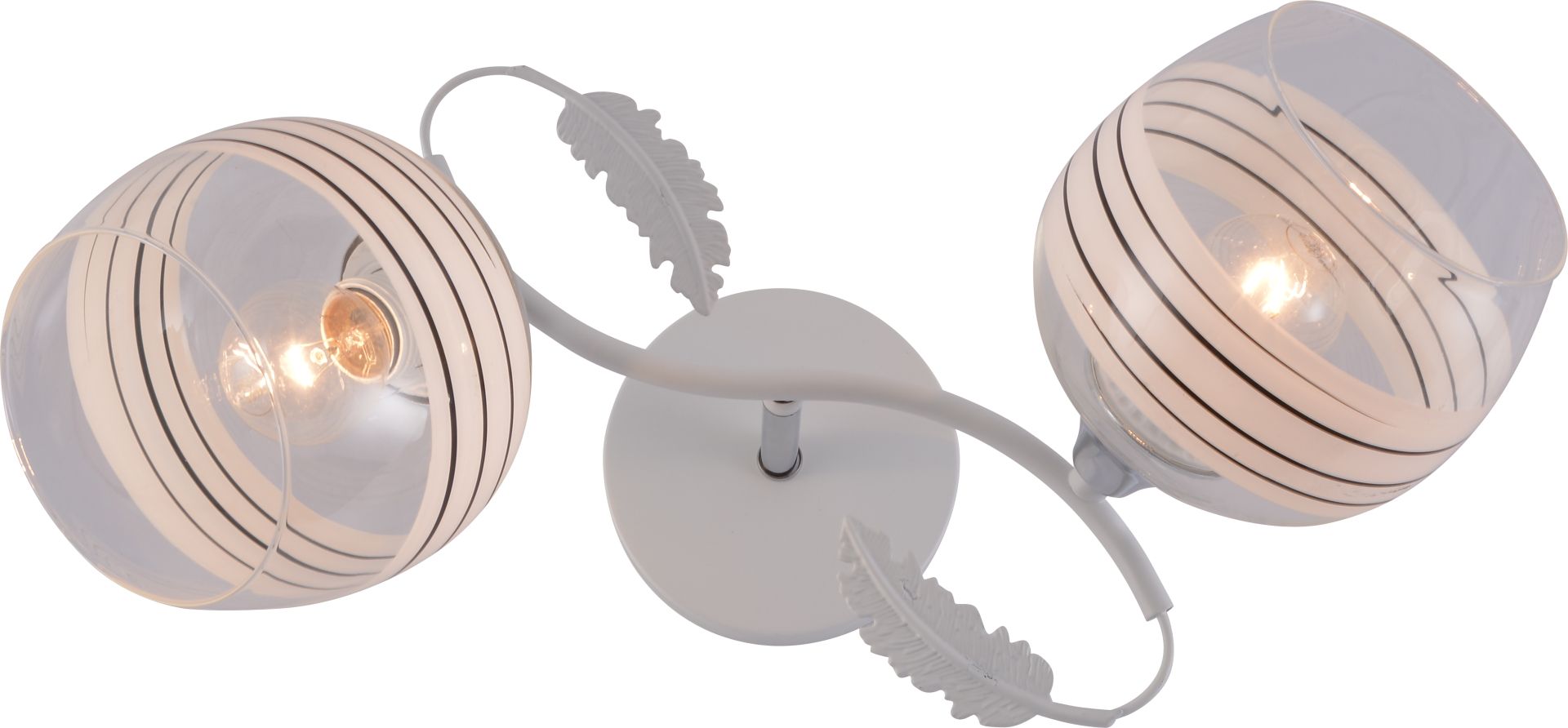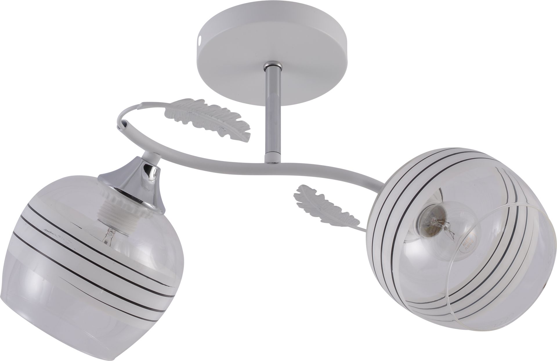 Модель оснащена двумя стеклянными плафонами, выполненными из прозрачного стекла, что обеспечивает хорошую светопроницаемость и наполняет пространство ярким, но вместе с тем комфортным освещением. Особый шарм придает декор в виде бело-черных полос — они создают выразительный контраст и придают люстре динамический, современный вид. Такой дизайн смотрится стильно и ненавязчиво, придавая интерьеру графичности и структуры.