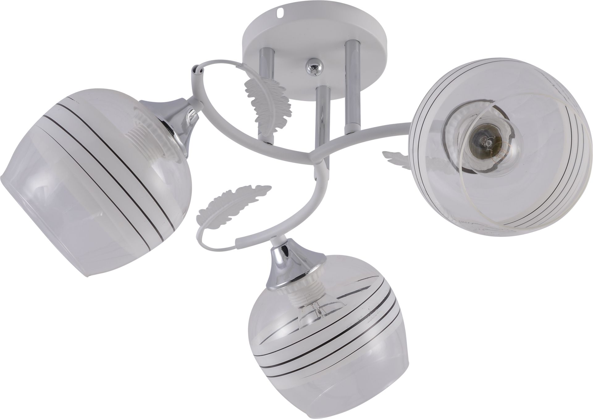 Модель оснащена тремя стеклянными плафонами, выполненными из прозрачного стекла, что обеспечивает хорошую светопроницаемость и наполняет простор ярким, но одновременно комфортным освещением. Особый шарм придает декор в виде бело-черных полос — они создают выразительный контраст и придают люстре динамический, современный вид. Такой дизайн смотрится стильно и ненавязчиво, придавая интерьеру графичности и структуры.