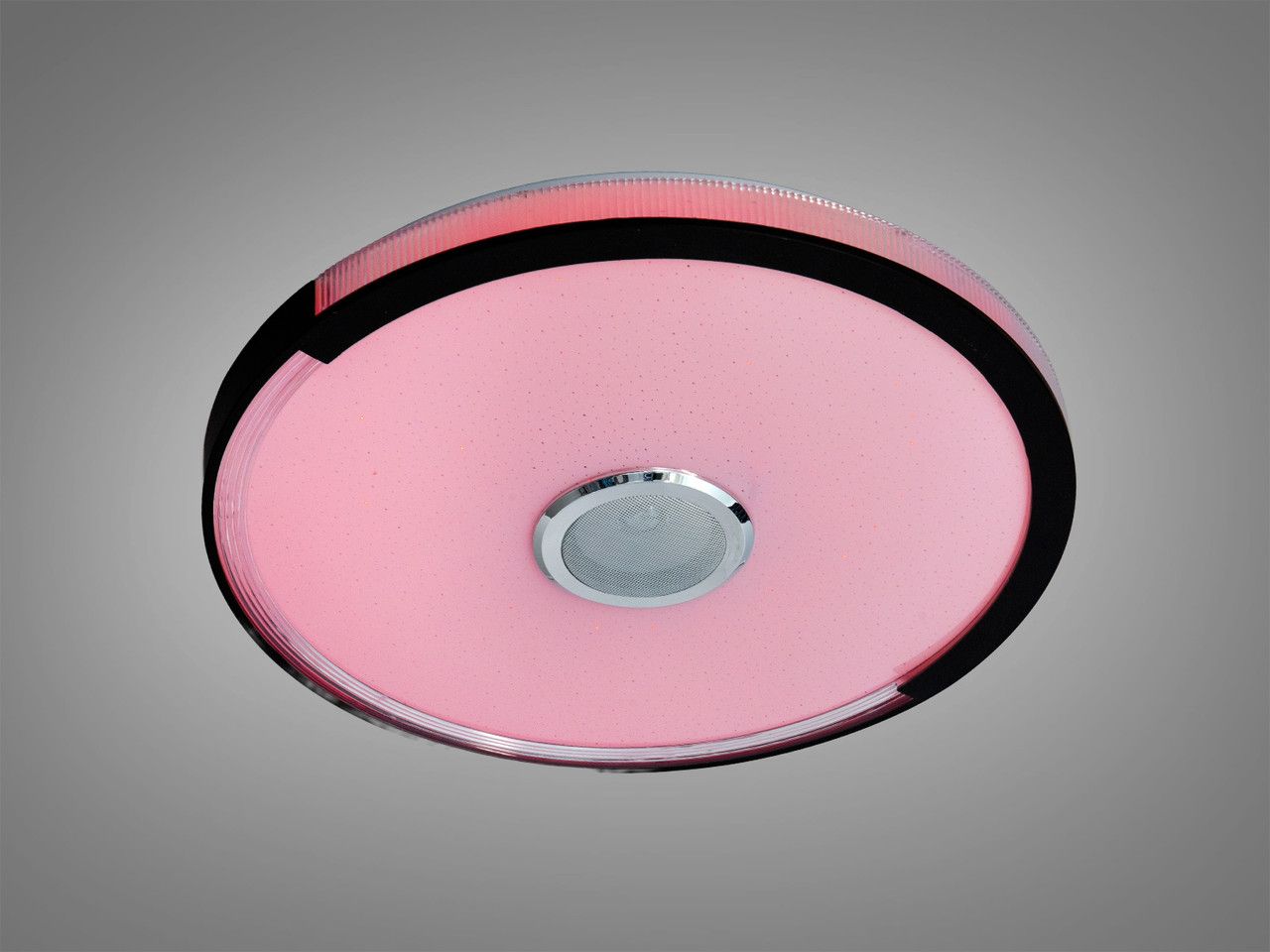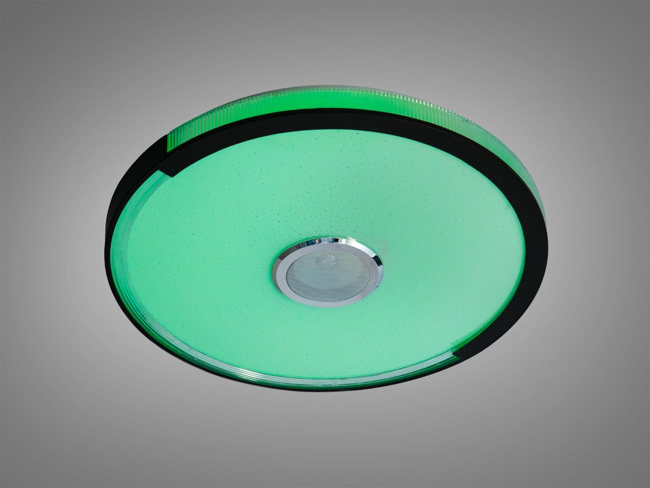 Светильник выполнен в форме диска диаметром 490 мм с современным акцентом в виде темного контурного кольца. Основание диаметром 450 мм изготовлено из металла, что обеспечивает стабильность и надежность монтажа. Плафон из высококачественного акрила имеет текстуру «Starry Sky», которая при включении создает визуальный эффект мерцающего звездного неба. В центре конструкции интегрирована Bluetooth колонка с хромированной окантовкой для объемного распределения звука.