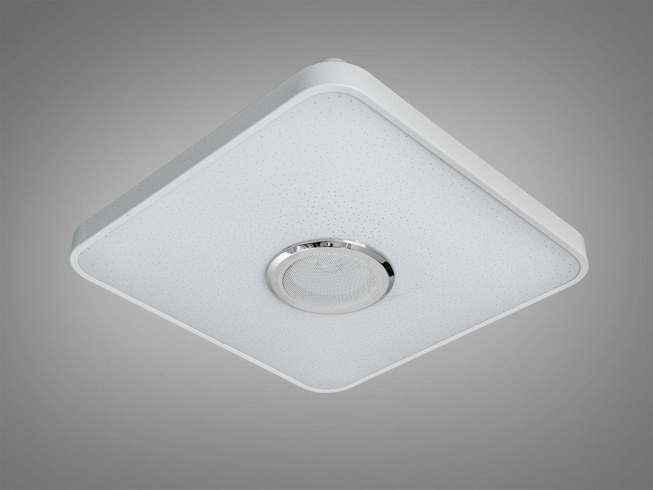 Светильник выполнен в современной квадратной форме со стороной 380 мм и ультранизким профилем высотой всего 60 мм. Усиленное металлическое основание габаритами 360х360 мм обеспечивает стабильность конструкции и эффективный отвод тепла от электронных компонентов. Плафон изготовлен из светотехнического акрила с эффектом «Starry Sky» (микроперфорация), имитирующим мерцающее звездное небо при включении. В центре расположена металлическая защитная сетка широкополосного динамика с хромированным окантованием.