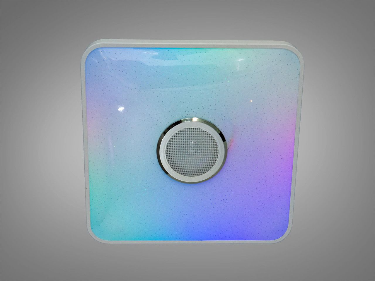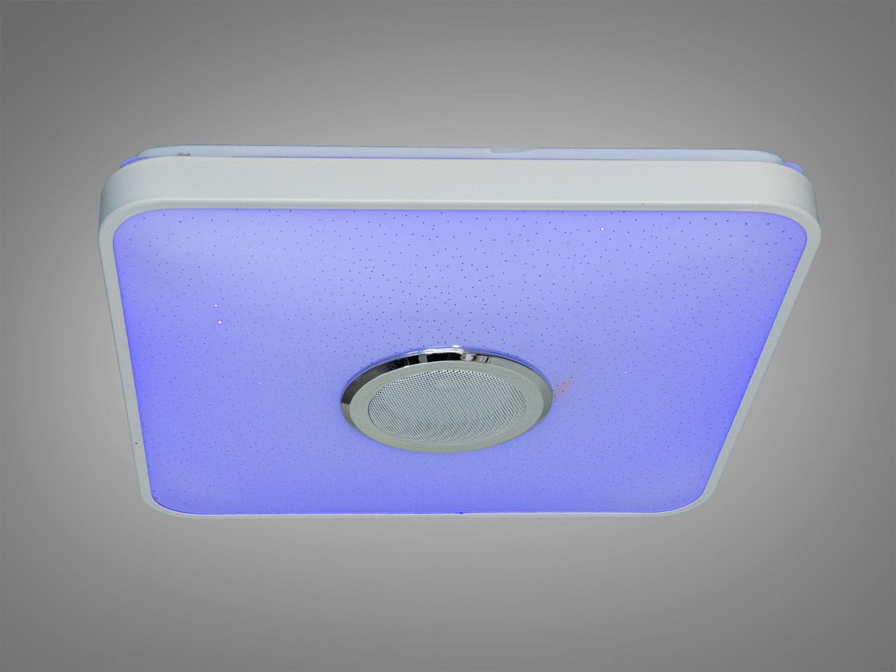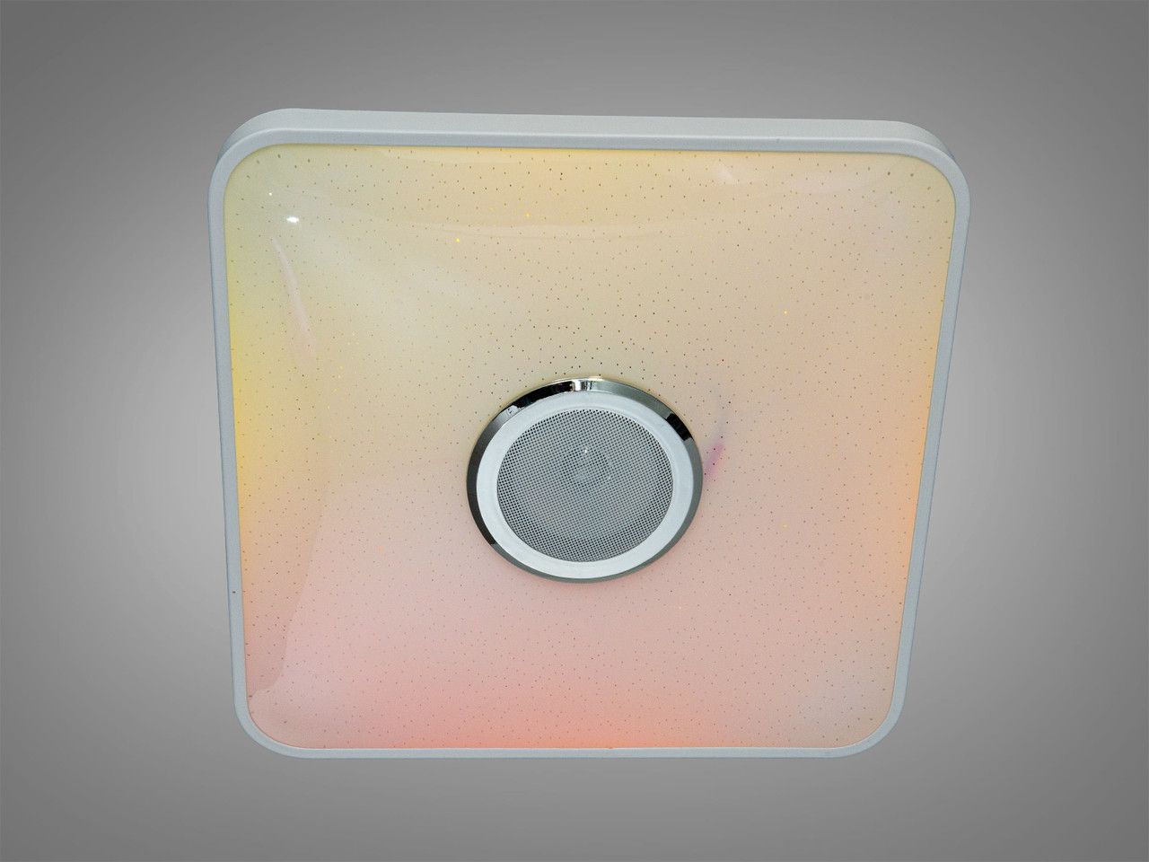 Светильник выполнен в современной квадратной форме со стороной 380 мм и имеет ультранизкий профиль высотой всего 60 мм. Усиленное металлическое основание габаритами 360х360 мм обеспечивает стабильность конструкции и эффективный отвод тепла. Плафон изготовлен из светотехнического акрила с эффектом «Starry Sky» (микроперфорация), имитирующим мерцающее звездное небо при включении. В центре расположена металлическая защитная сетка широкополосного динамика с хромированным окантованием.