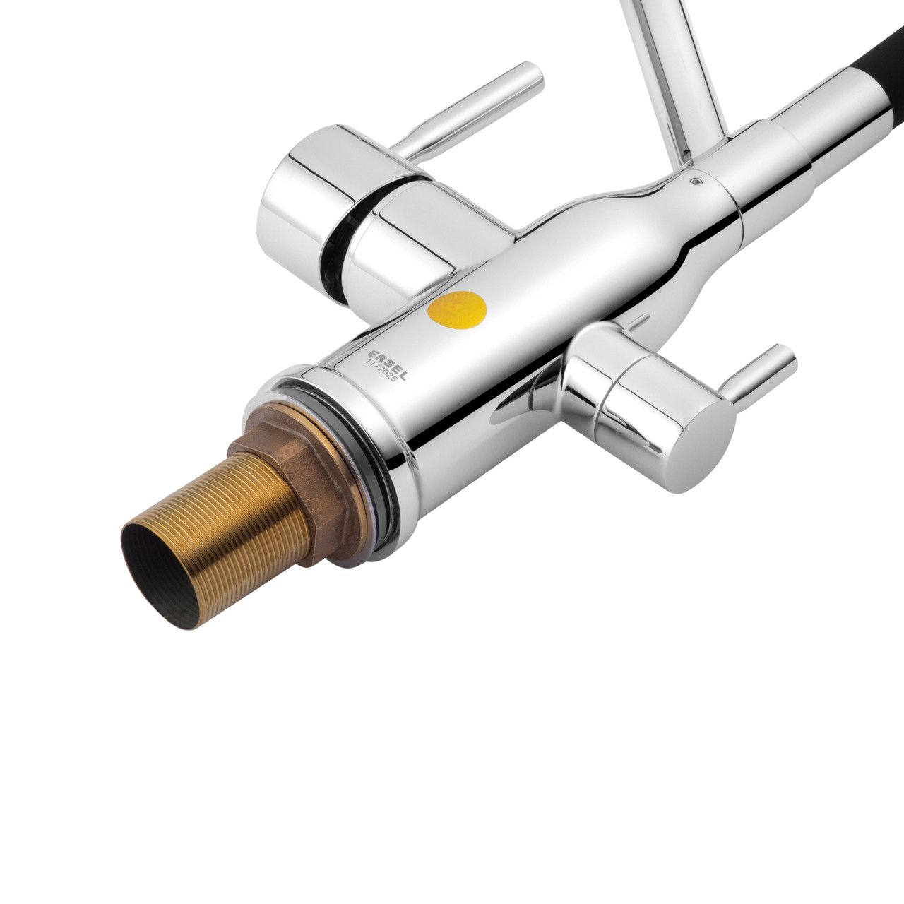 Основные характеристики: латунный корпус, однорычажное управление, гибкий излив, отдельный канал для питьевой воды, монтаж на одно отверстие.