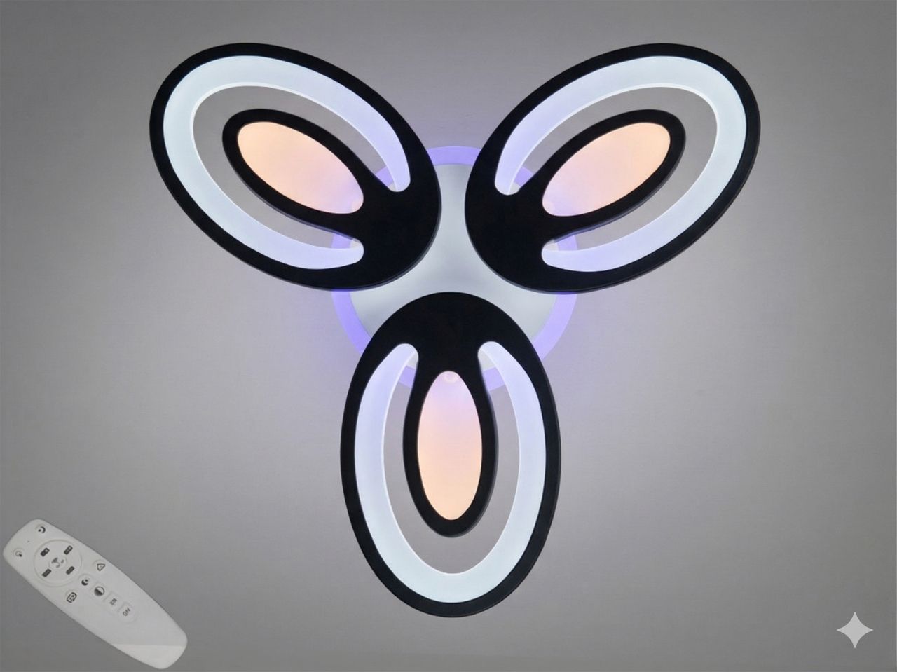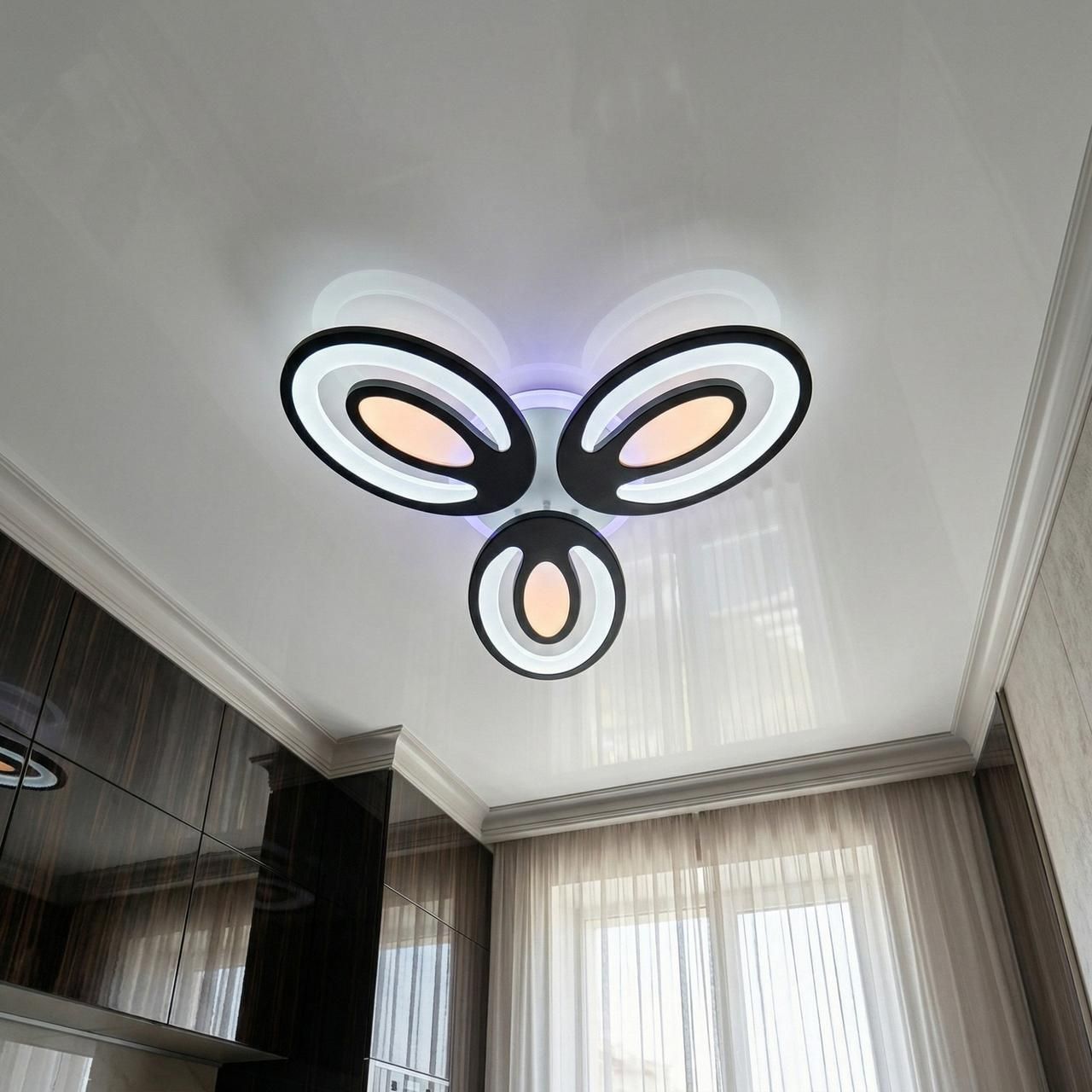 Эта современная светодиодная люстра мощностью 60W разработана для качественного освещения жилых зон площадью до 16 м². Геометрический дизайн из трех переплетенных колец в сочетании с глубоким черным матовым покрытием и ультратонким профилем (8 см) создает эффектный контраст на фоне потолка, обеспечивая поток 3300 lm и атмосферную контурную подсветку.