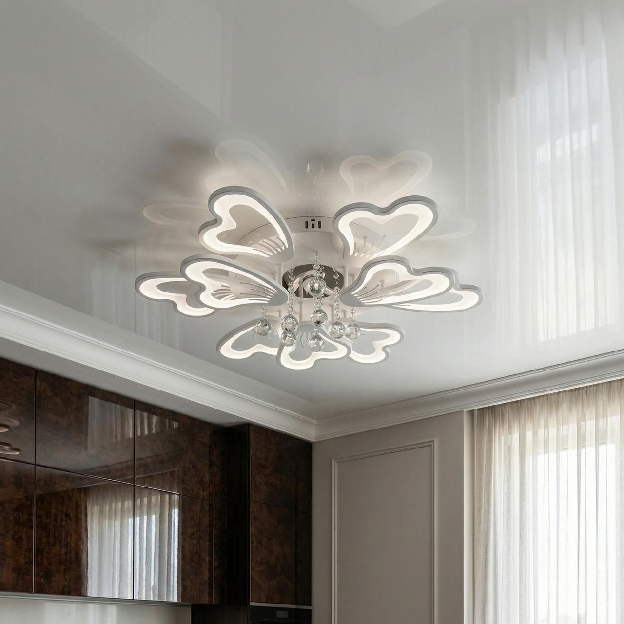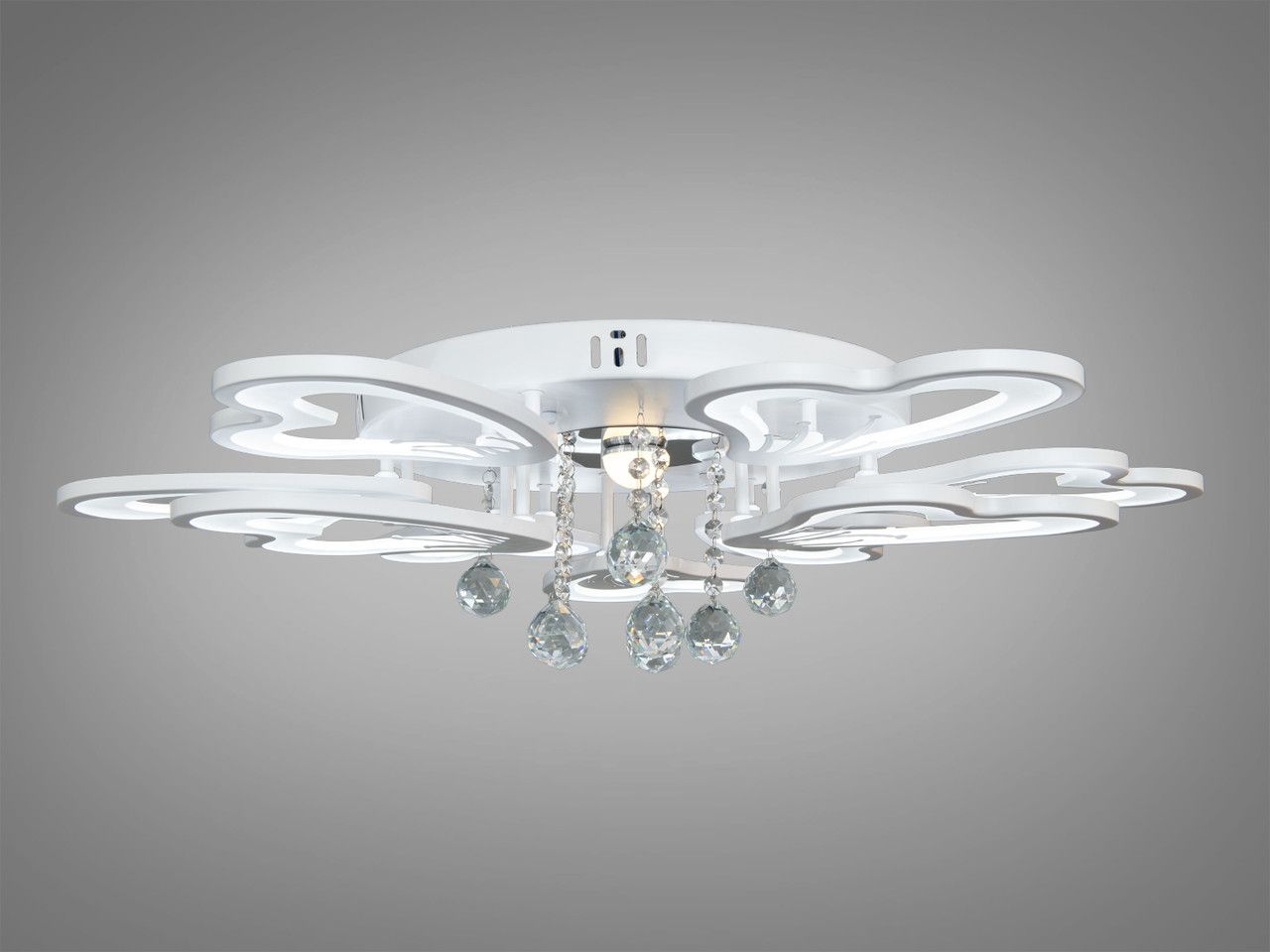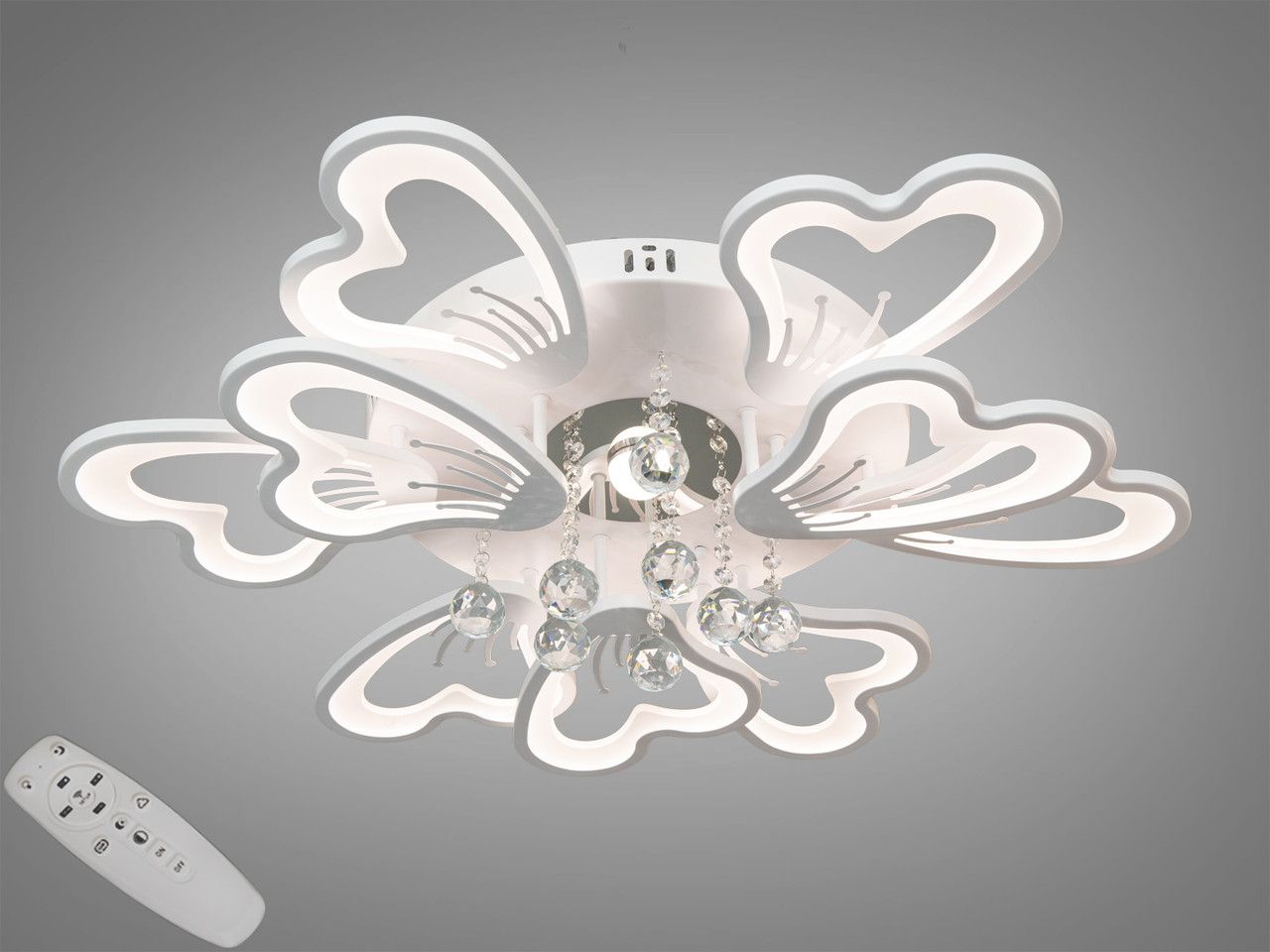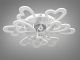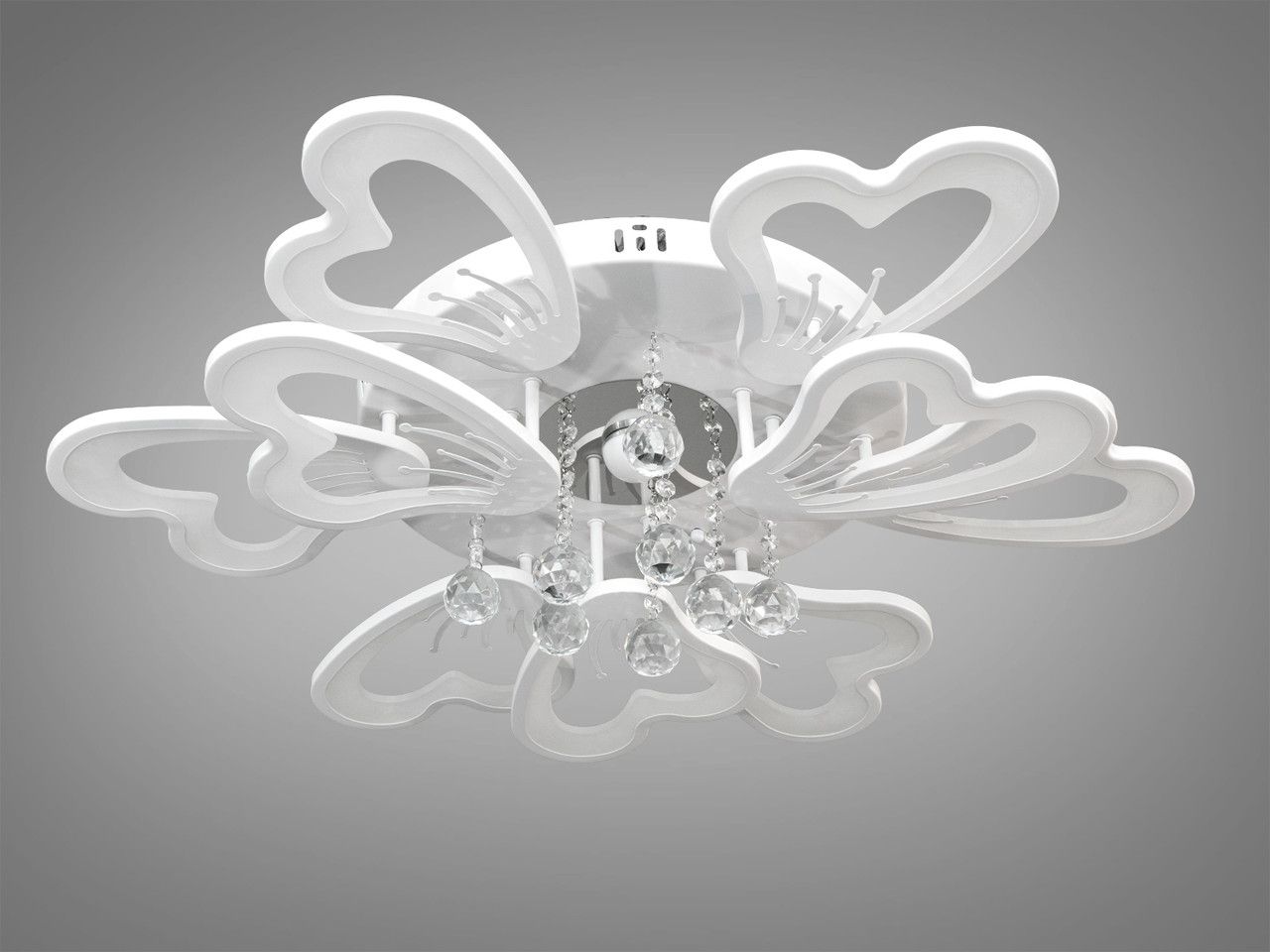Модель имеет эффектную многоярусную структуру, состоящую из 9 световых модулей (6 больших и 3 малых лепестков) в форме стилизованных сердец. Белый матовый корпус гармонично сочетается с прозрачными акриловыми вставками. В центральной части расположен декоративный узел с подвесками из граненого хрусталя, которые создают дополнительные световые преломления. При диаметре 82 см и высоте 20 см конструкция выглядит объемно и служит центральным арт-объектом интерьера.