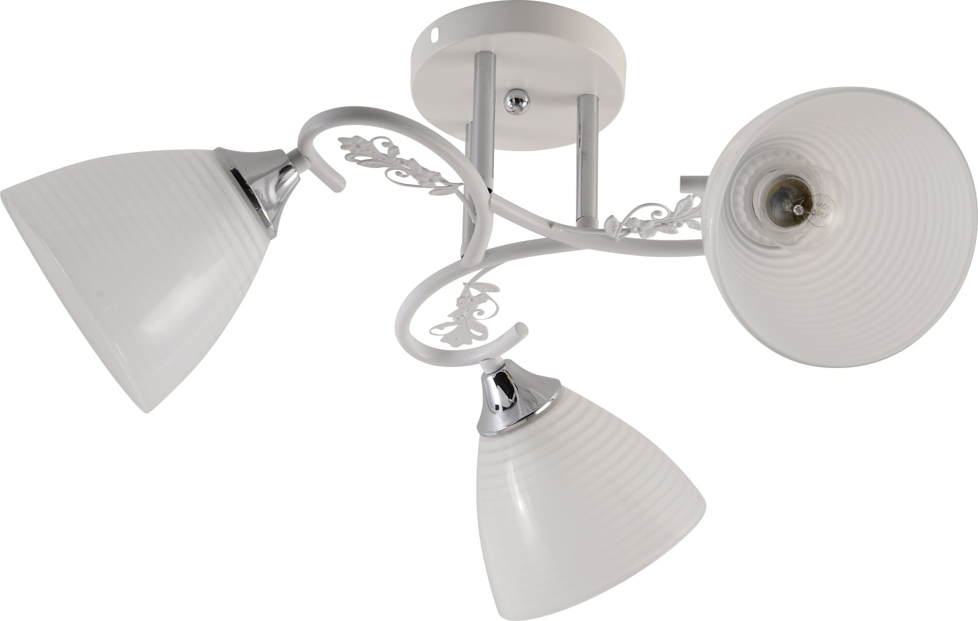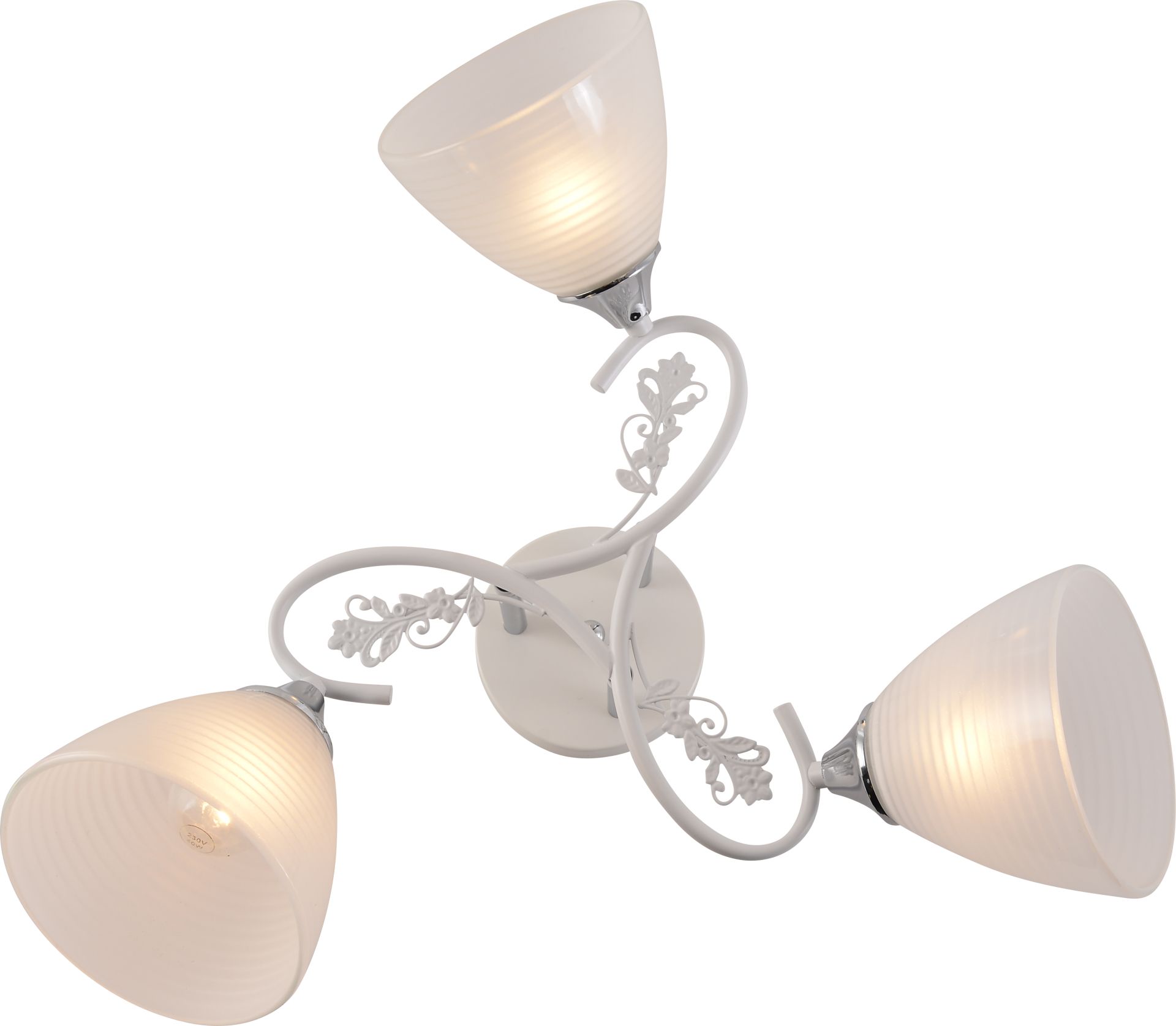 Модель оснащена тремя стеклянными плафонами конусной формы, выполненными из матового стекла. Ребристая рельефная поверхность придает изделию изысканности и создает особый световой эффект.