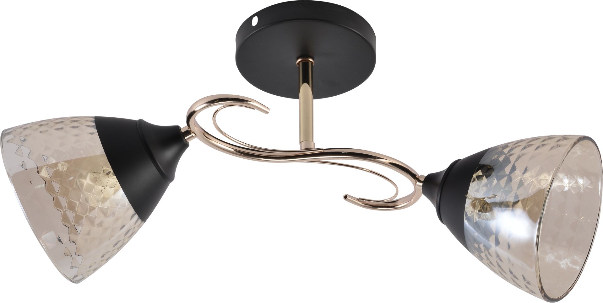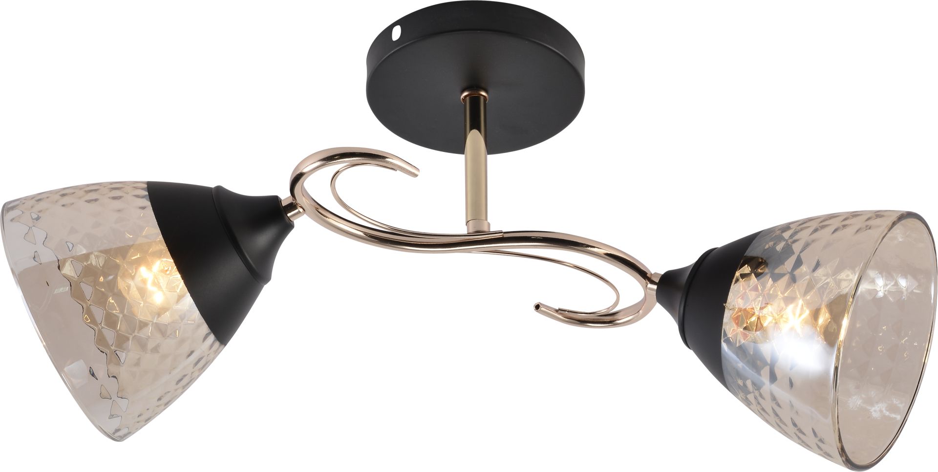 Каркас изготовлен из металла в черном и позолоченном цвете, придавая вашему интерьеру современный и стильный акцент. Два плафона из стекла в черном и коричневом оттенке равномерно рассеивают свет, создавая приятное освещение для вашего помещения.