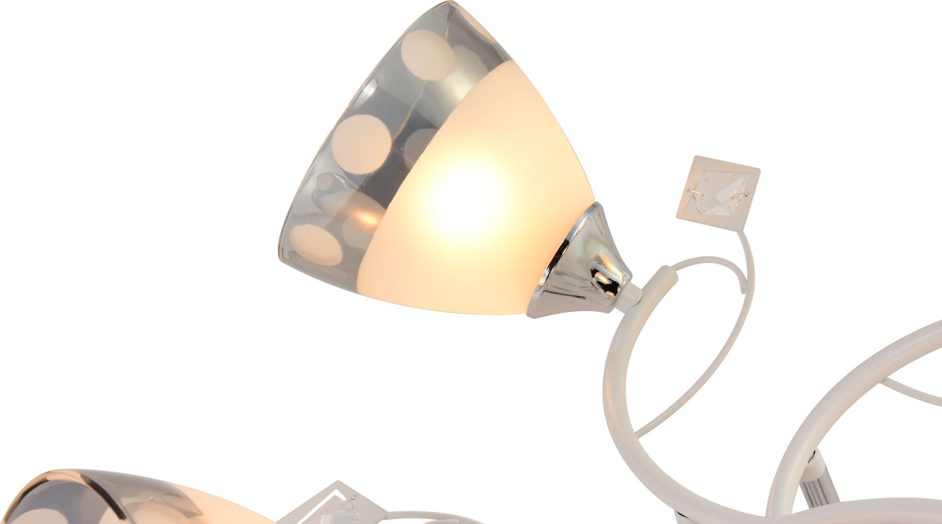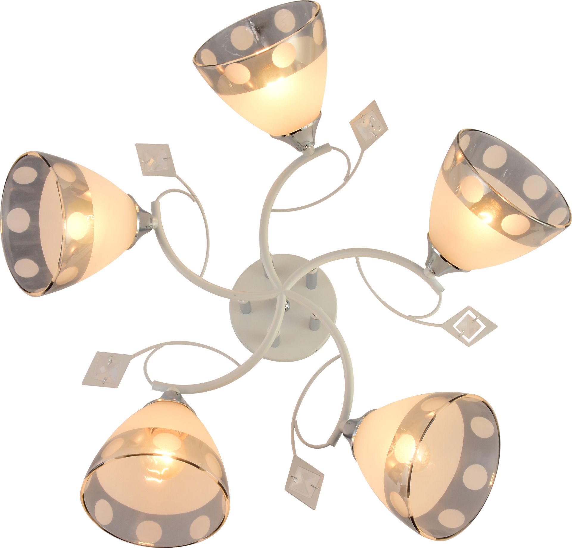 пять стеклянных плафонов матового цвета украшены изящной хромовой полосой с декоративными кружочками, что придает люстре особый шарм и делает ее настоящим акцентом в помещении. Благодаря такому дизайну, свет мягко рассеивается, создавая комфортную и уютную атмосферу без резких бликов.