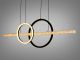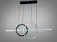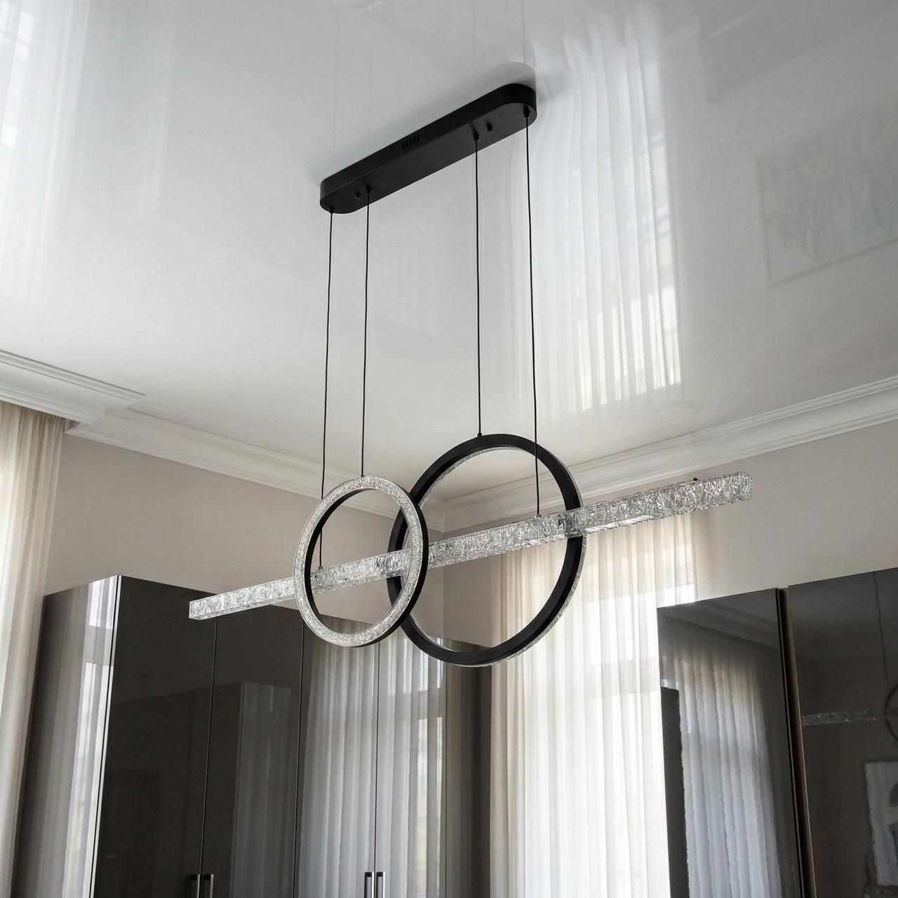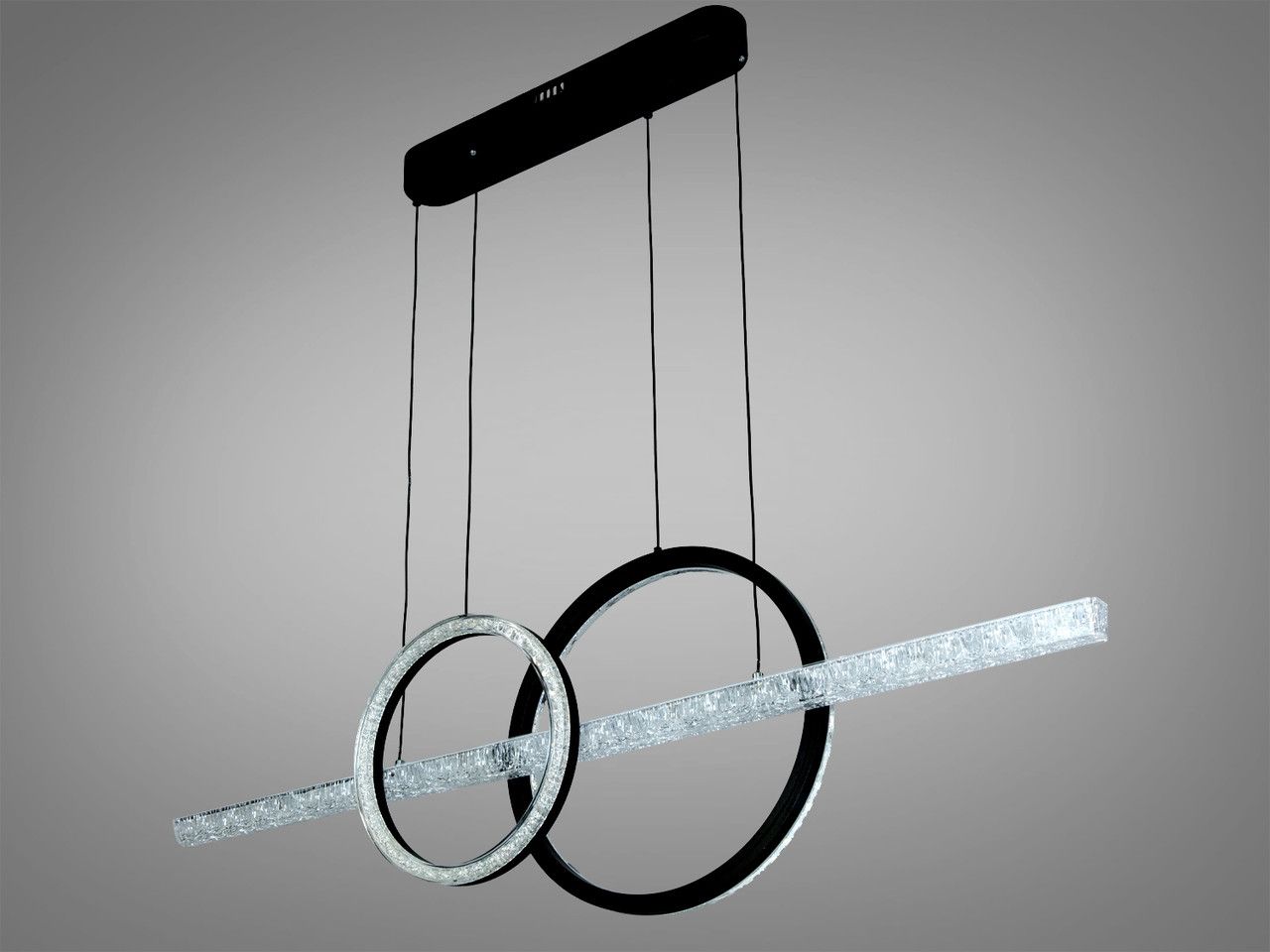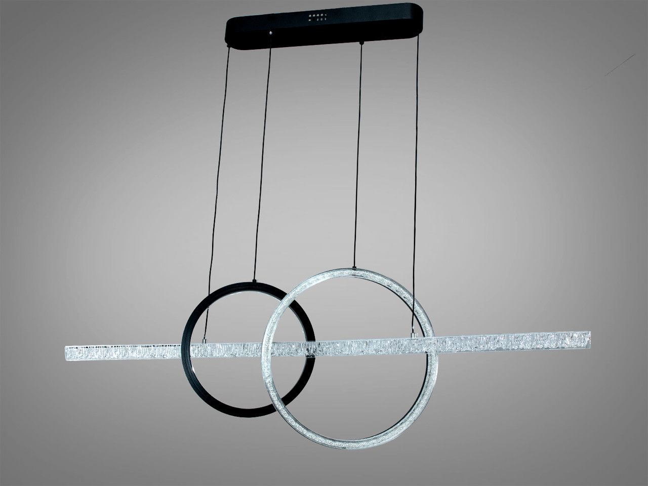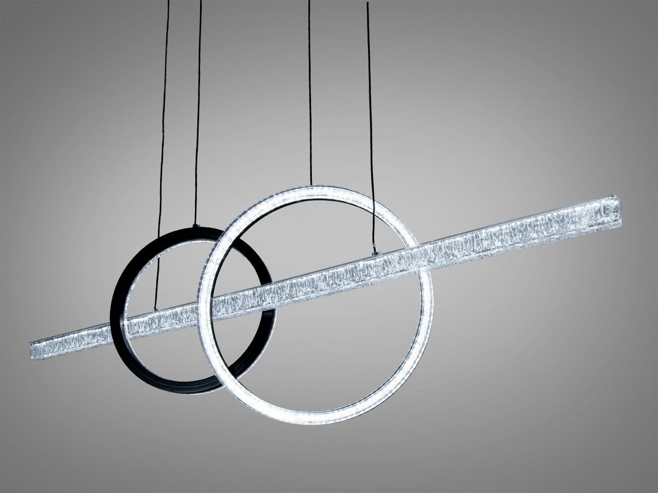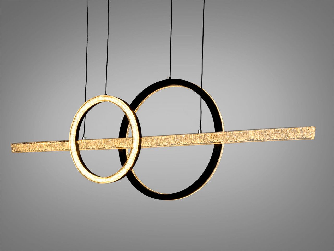 Концепция светильника базируется на эстетике орбитальных путей: горизонтальная световая штанга проходит сквозь два кольца разного диаметра. Черный матовый корпус из металла придает конструкции графичность, а акриловые рассеиватели с мелкозернистой фактурой создают эффект «кристального сияния». Благодаря внушительной длине (120 см), люстра идеально центрирует пространство над вытянутыми поверхностями, создавая объемную световую композицию.