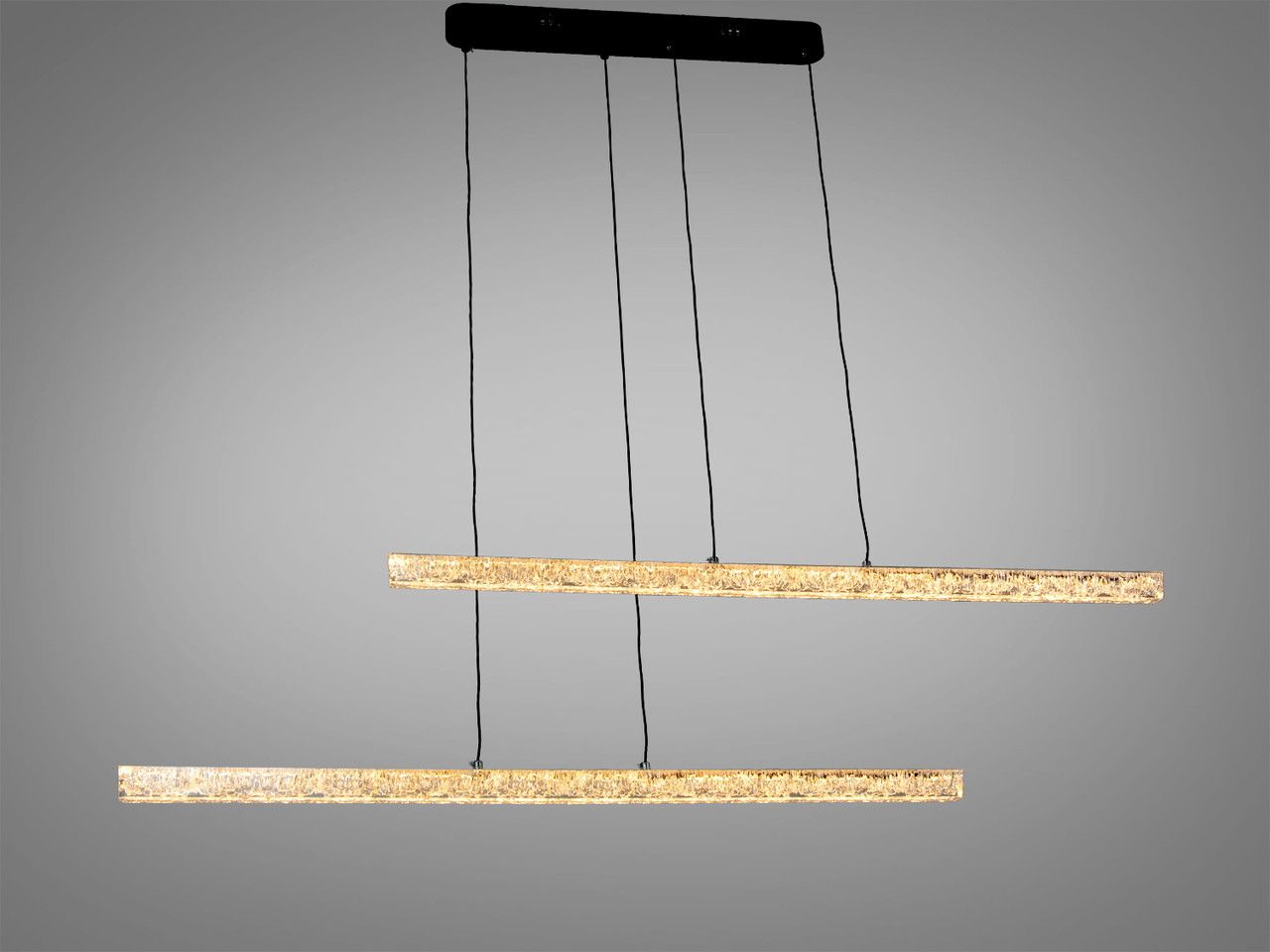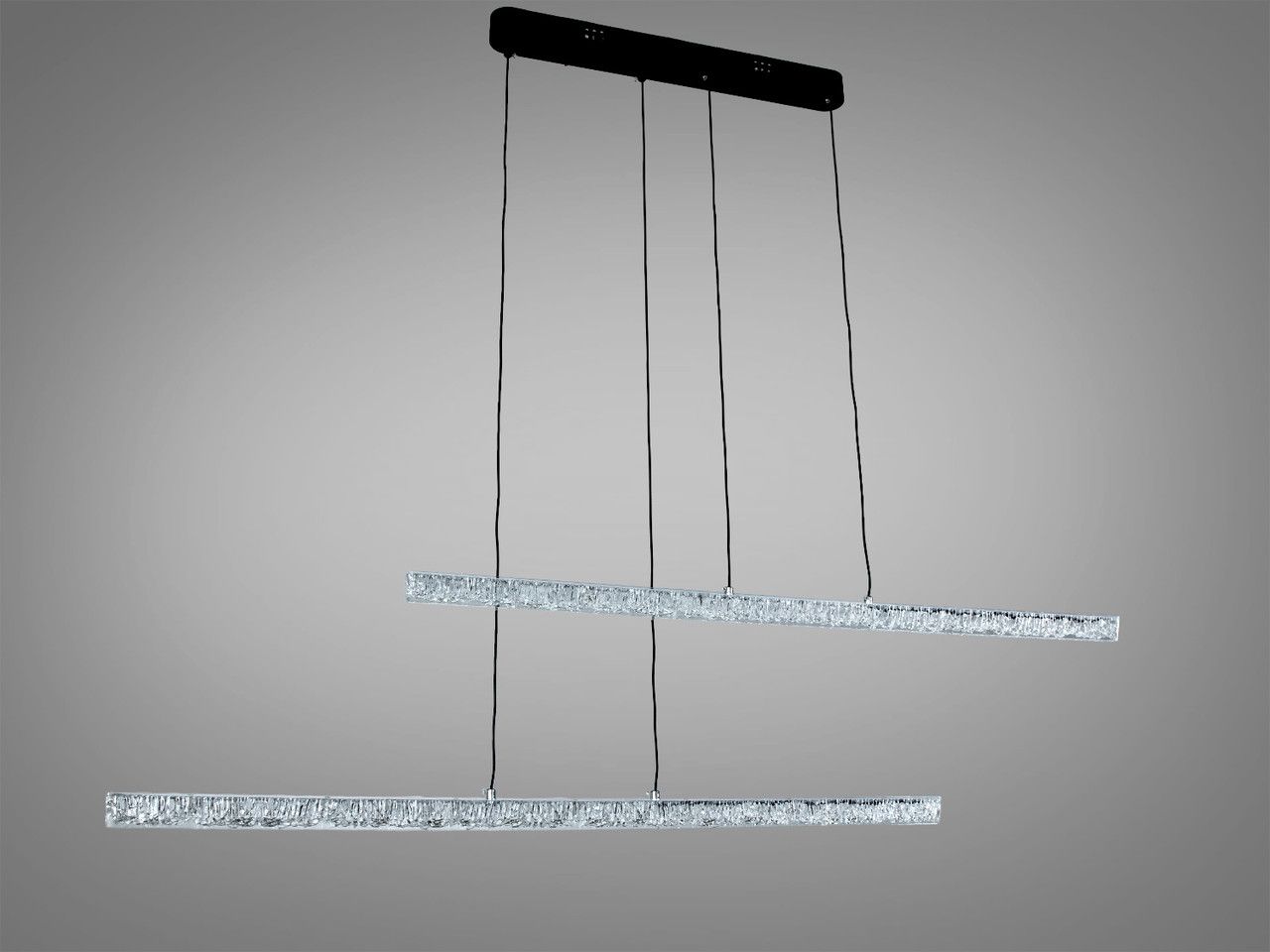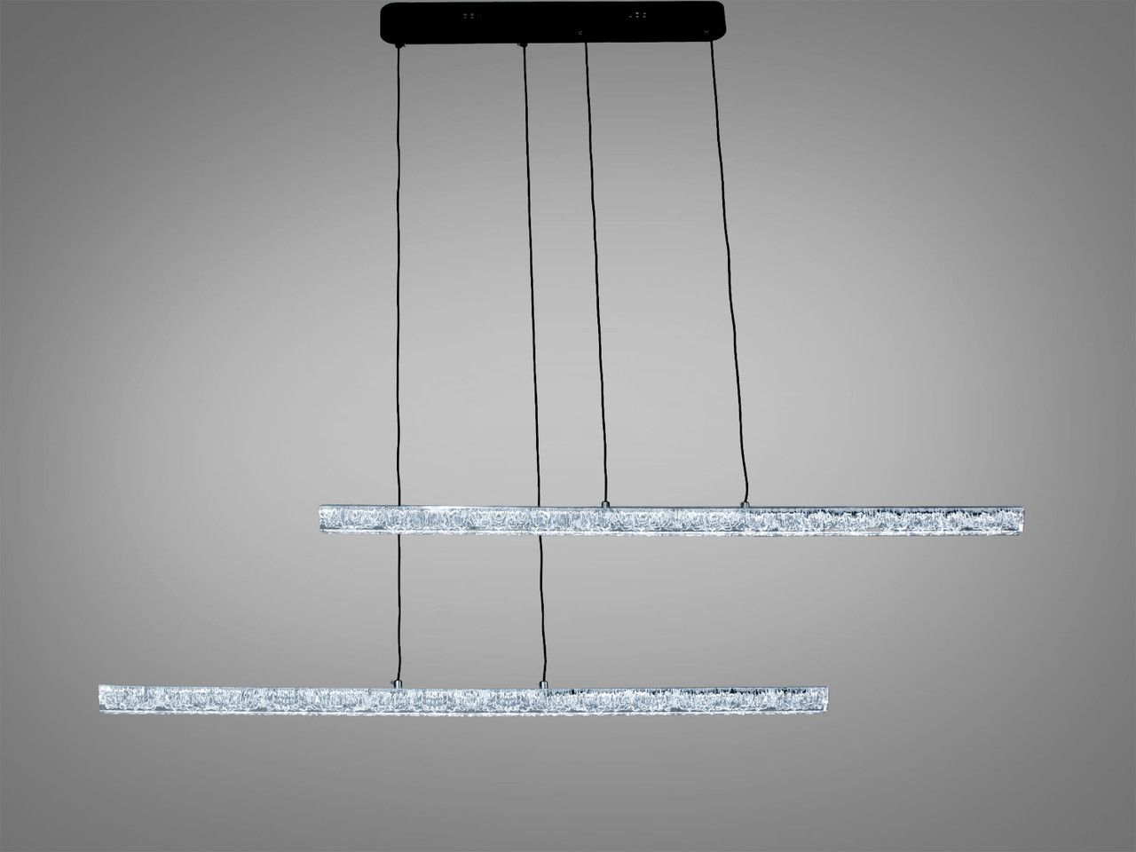 Эта ультрасовременная LED люстра длиной 135 см представляет собой воплощение архитектурного минимализма. Модель, состоящая из двух световых линий с фактурным акрилом «битый лед», создает эффект парящих кристаллов и обеспечивает мягкое, многогранное освещение для современных интерьеров.