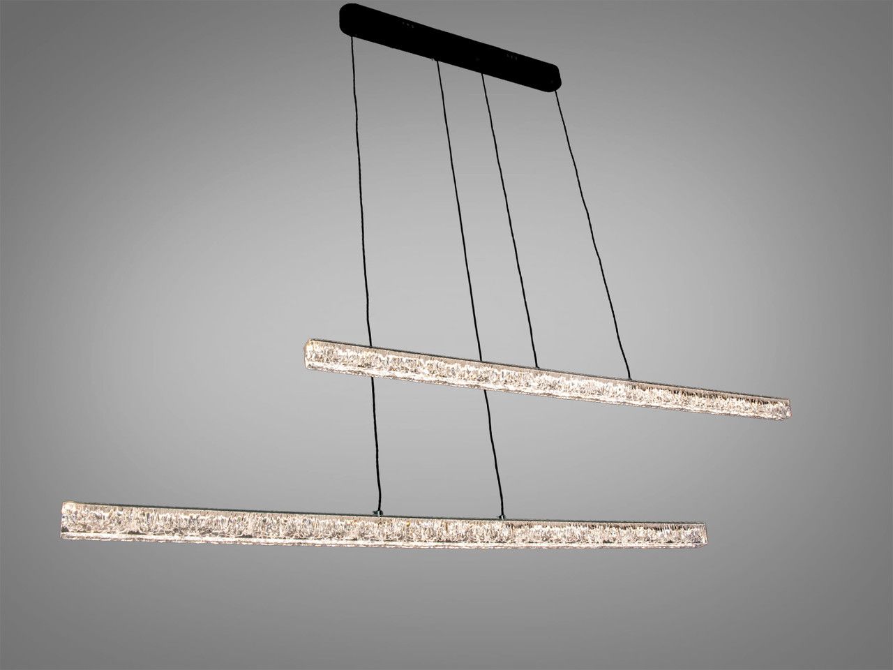 Визуальный образ люстры строится на строгой геометрии и игре света в деталях. Черный матовый корпус из металла служит обрамлением для световых модулей. Внутри каждой линии расположен акриловый рассеиватель с уникальной внутренней фактурой, которая имитирует сияние натурального хрусталя или замерзшей воды. Две независимые балки подвешены на тонких тросах, что позволяет создавать разные композиции: располагать их параллельно, на разных уровнях или под углом друг к другу.