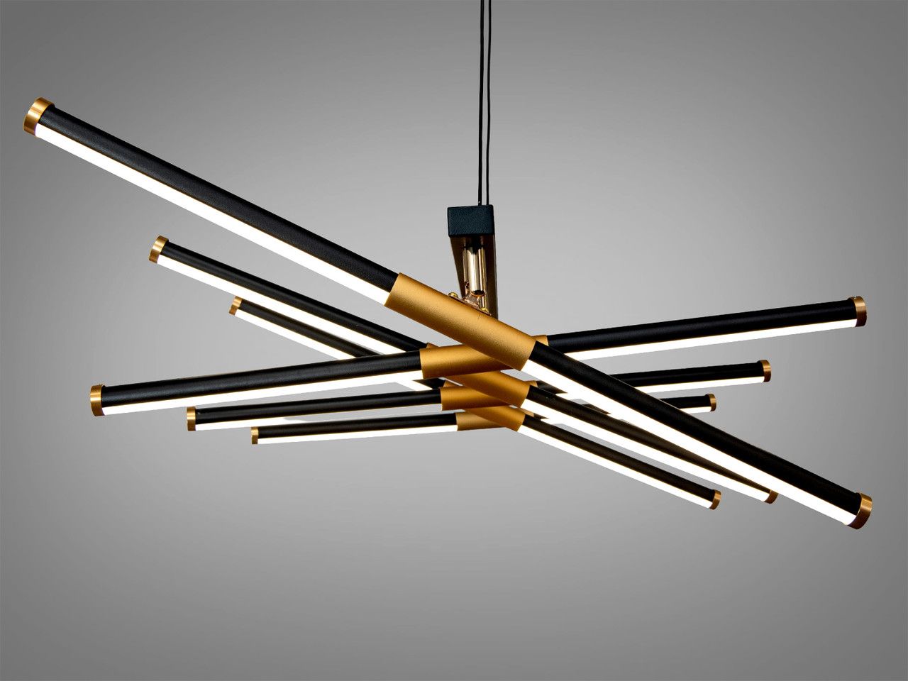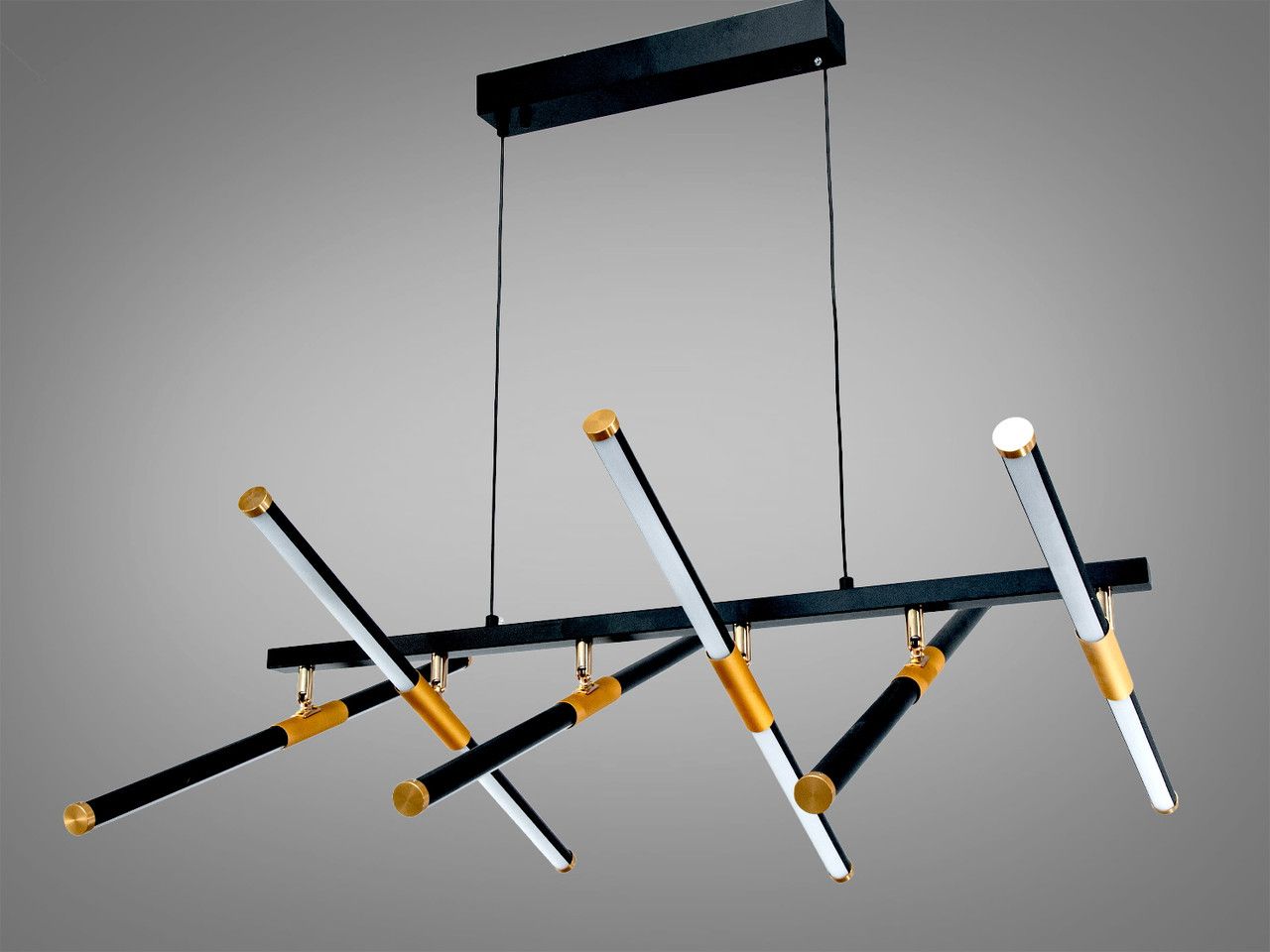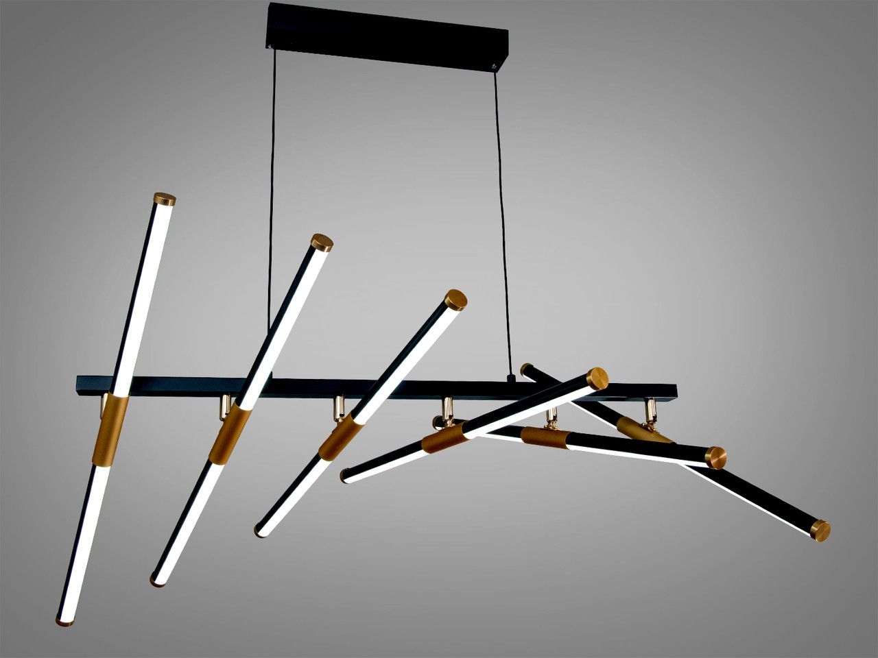 Визуальный образ светильника строится на строгой геометрии и контрасте цветов. Черный матовый каркас дополнен элегантными золотистыми наконечниками, выполненными методом гальванического покрытия. Шесть световых трубок расположены под разными углами к центральной оси, что создает объемную структуру и позволяет свету распространяться равномерно во всех направлениях. Акриловые рассеиватели обеспечивают мягкое, комфортное свечение по всей длине элементов, имитируя неоновые лучи.