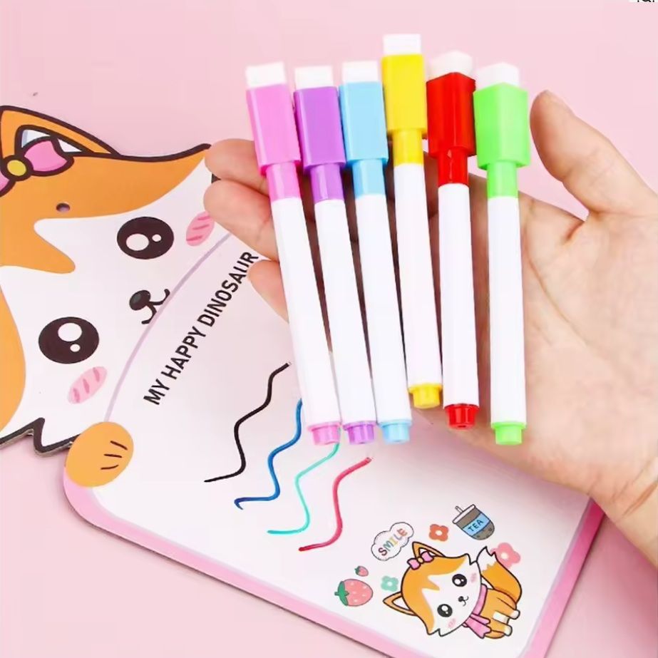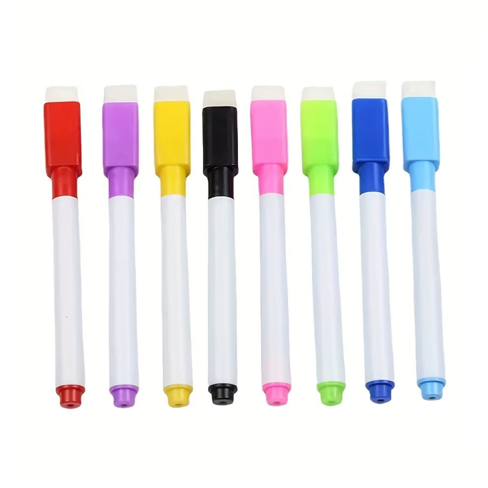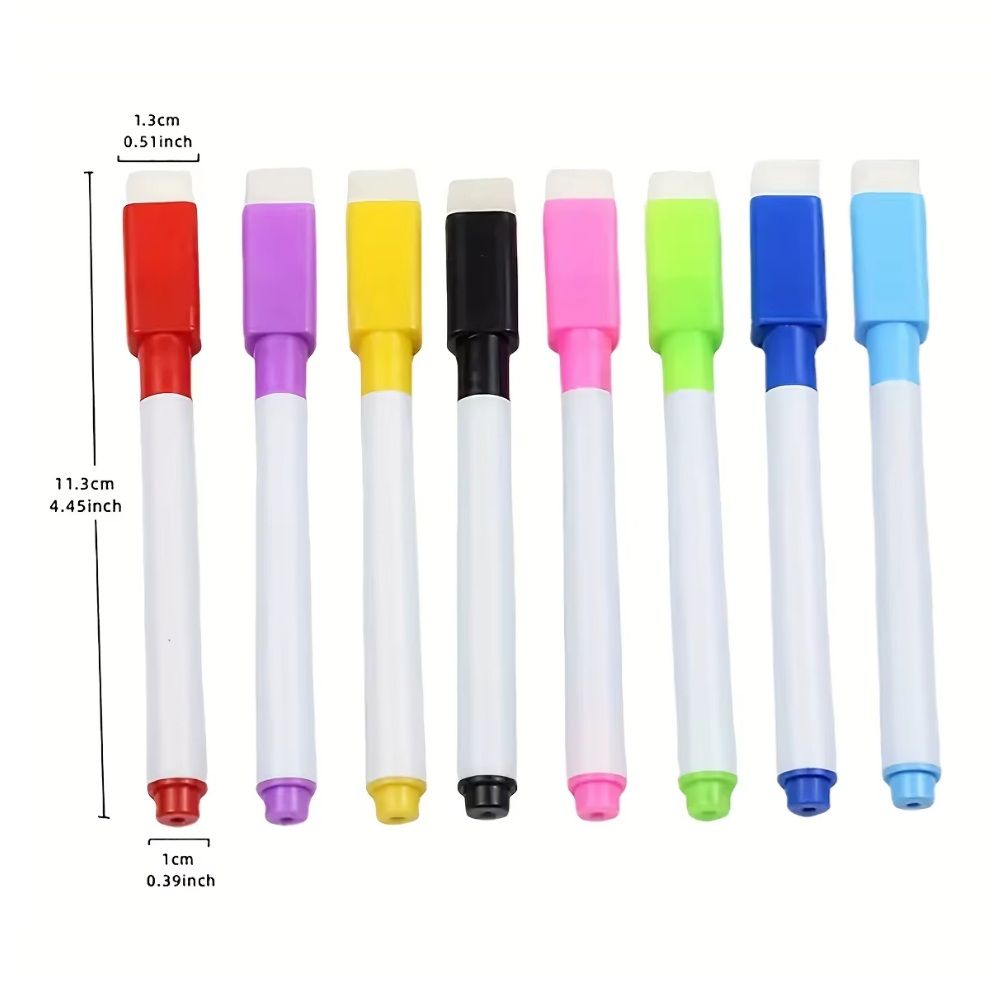 Это практичный комплект из 8 маркеров ярких цветов, предназначенный для письма и рисования на вайтбордах. Маркеры выполнены на водной основе, легко стираются сухой губкой и не оставляют следов. Благодаря встроенному магниту и губке, их удобно хранить прямо на поверхности доски, обеспечивая быстрый доступ в любой момент.