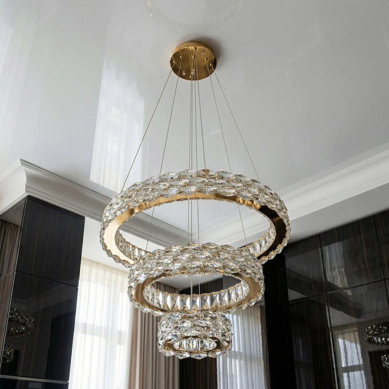 Эта величественная трехъярусная люстра представляет собой гармоничное сочетание классической роскоши и современных SMART-технологий. Модель, состоящая из трех сияющих колец, инкрустированных крупным хрусталем, обеспечивает яркое и многогранное освещение, превращая потолочную зону в драгоценное украшение интерьера.