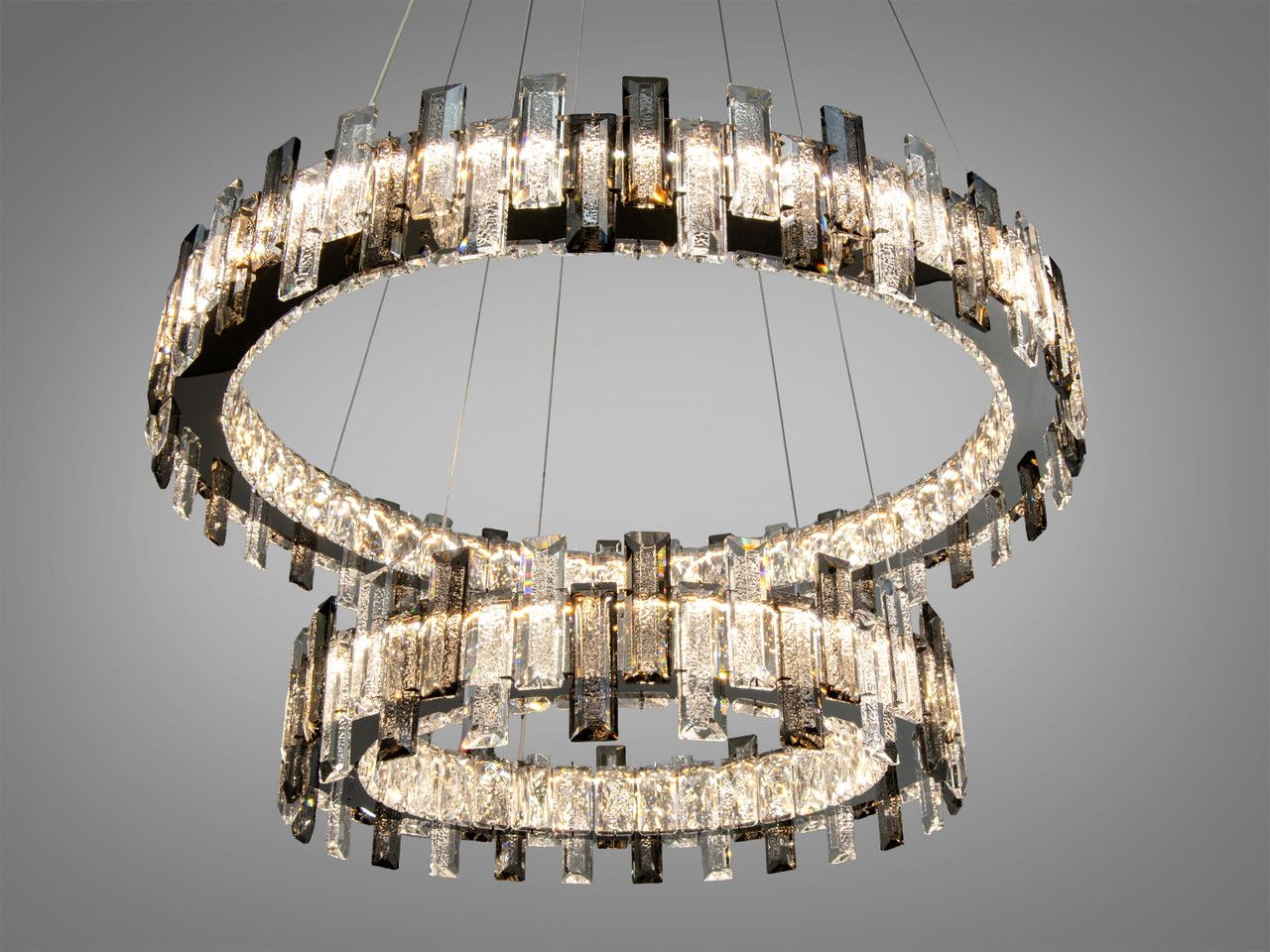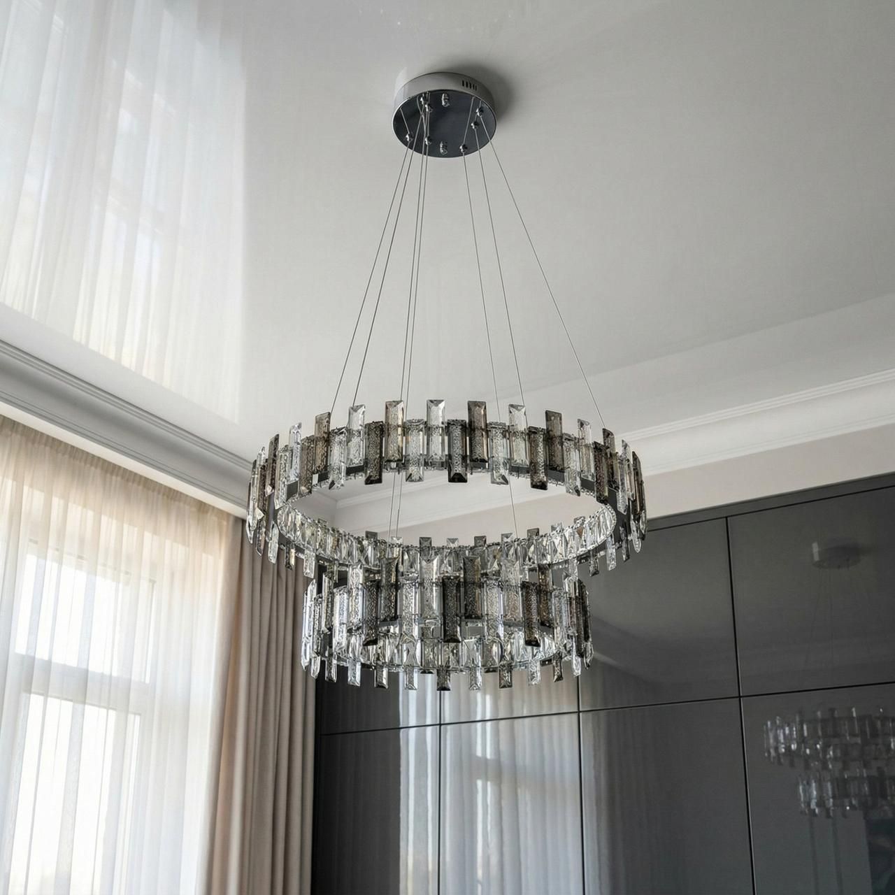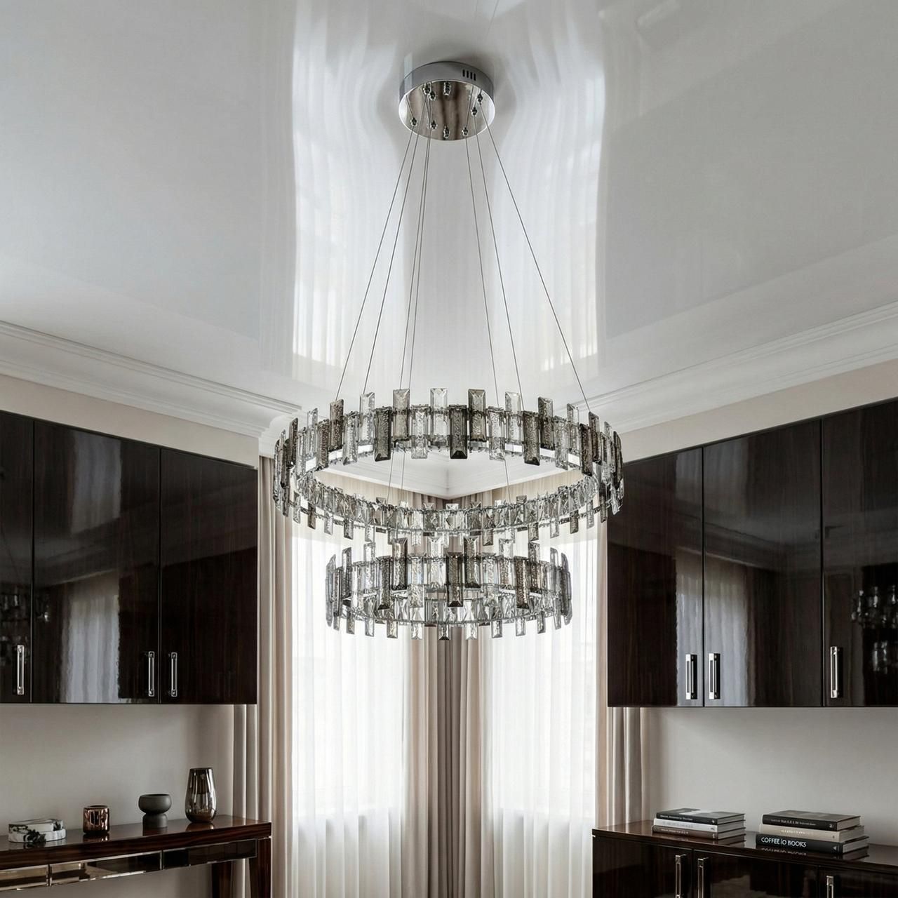 Эта изысканная двухъярусная люстра представляет собой гармоничное сочетание классической роскоши и современных SMART-технологий. Модель, состоящая из двух сияющих колец, инкрустированных вертикальным хрусталем, обеспечивает мягкое многогранное освещение и становится центральным арт-объектом современного интерьера.
