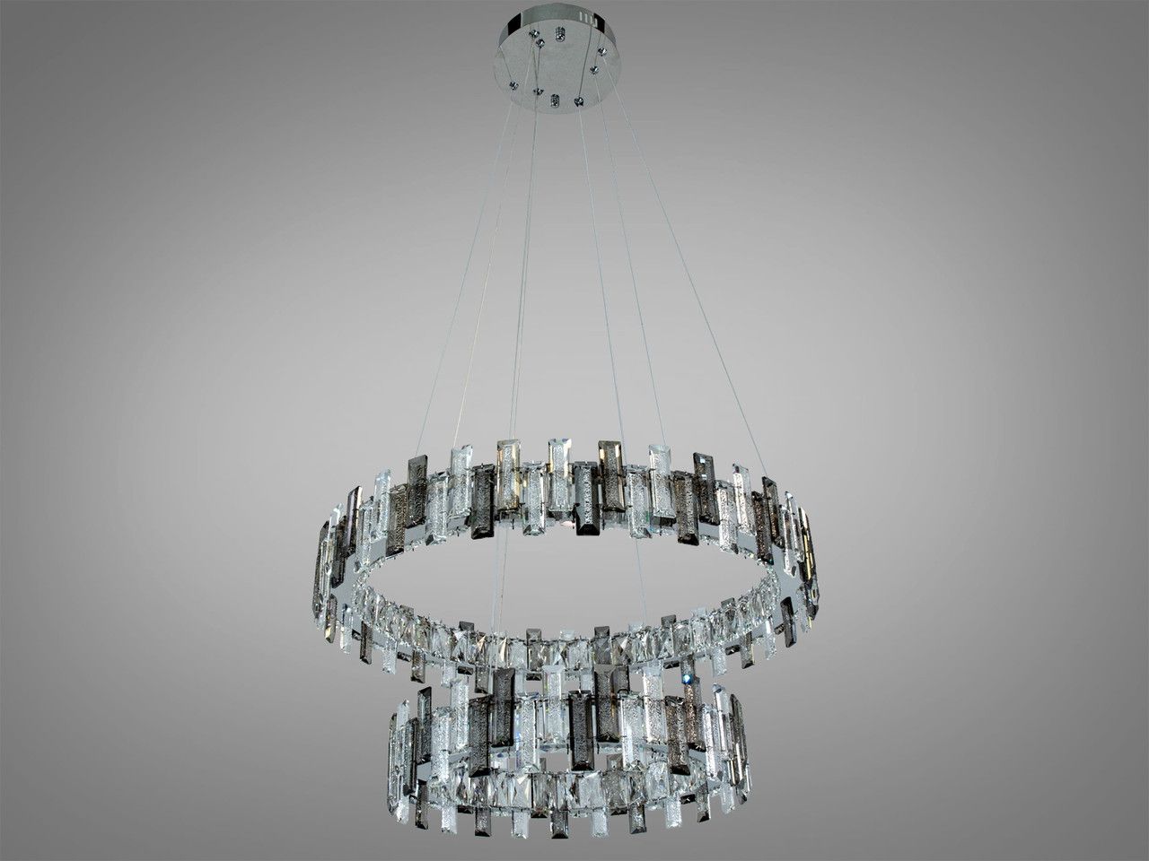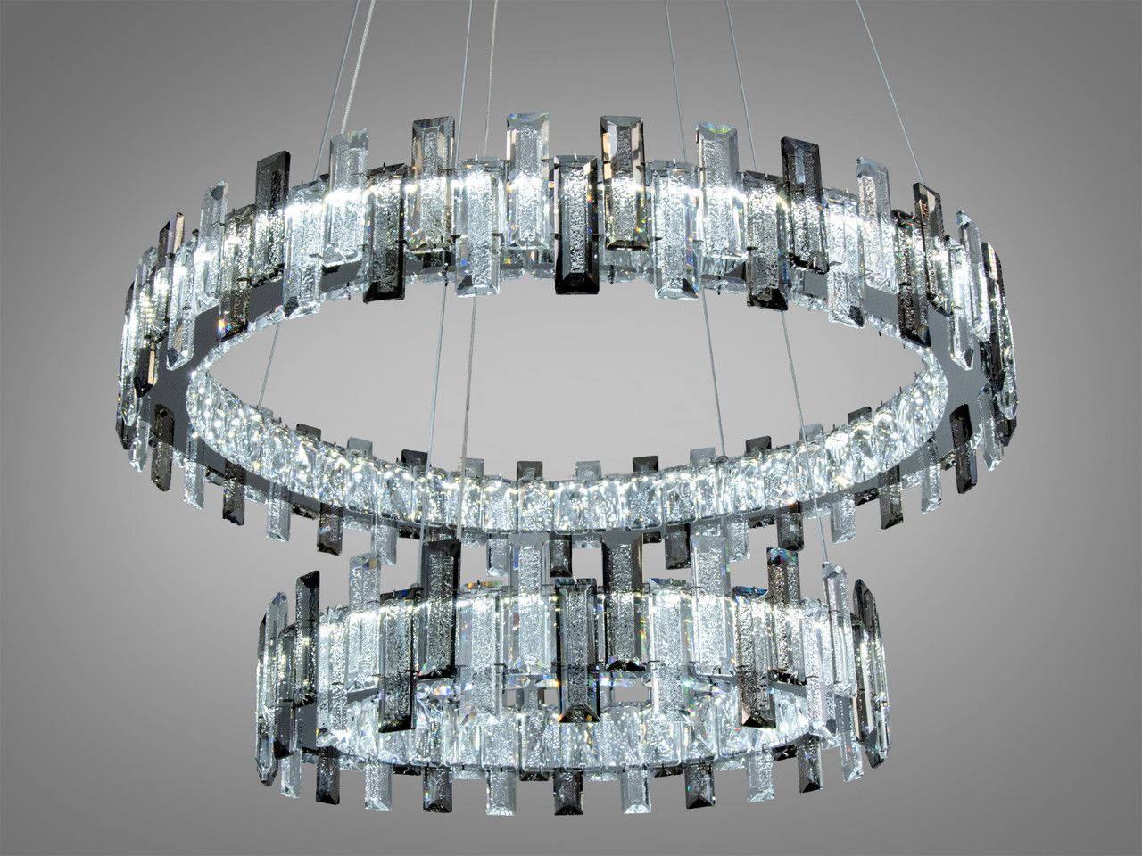 Визуальный образ люстры строится на архитектурности форм и безупречном зеркальном блеске. Два независимых яруса (общим диаметром 58 см) выполнены из металла с высококачественным гальваническим покрытием цвета хром. Декоративное наполнение состоит из плотных рядов прозрачных хрустальных пластин прямоугольной огранки. При включении встроенной светодиодной ленты лучи проходят сквозь грани хрусталя, многократно преломляясь и создавая тысячи радужных бликов. Зеркальное основание дополнительно отражает свет, визуально увеличивая высоту потолка и объем помещения.