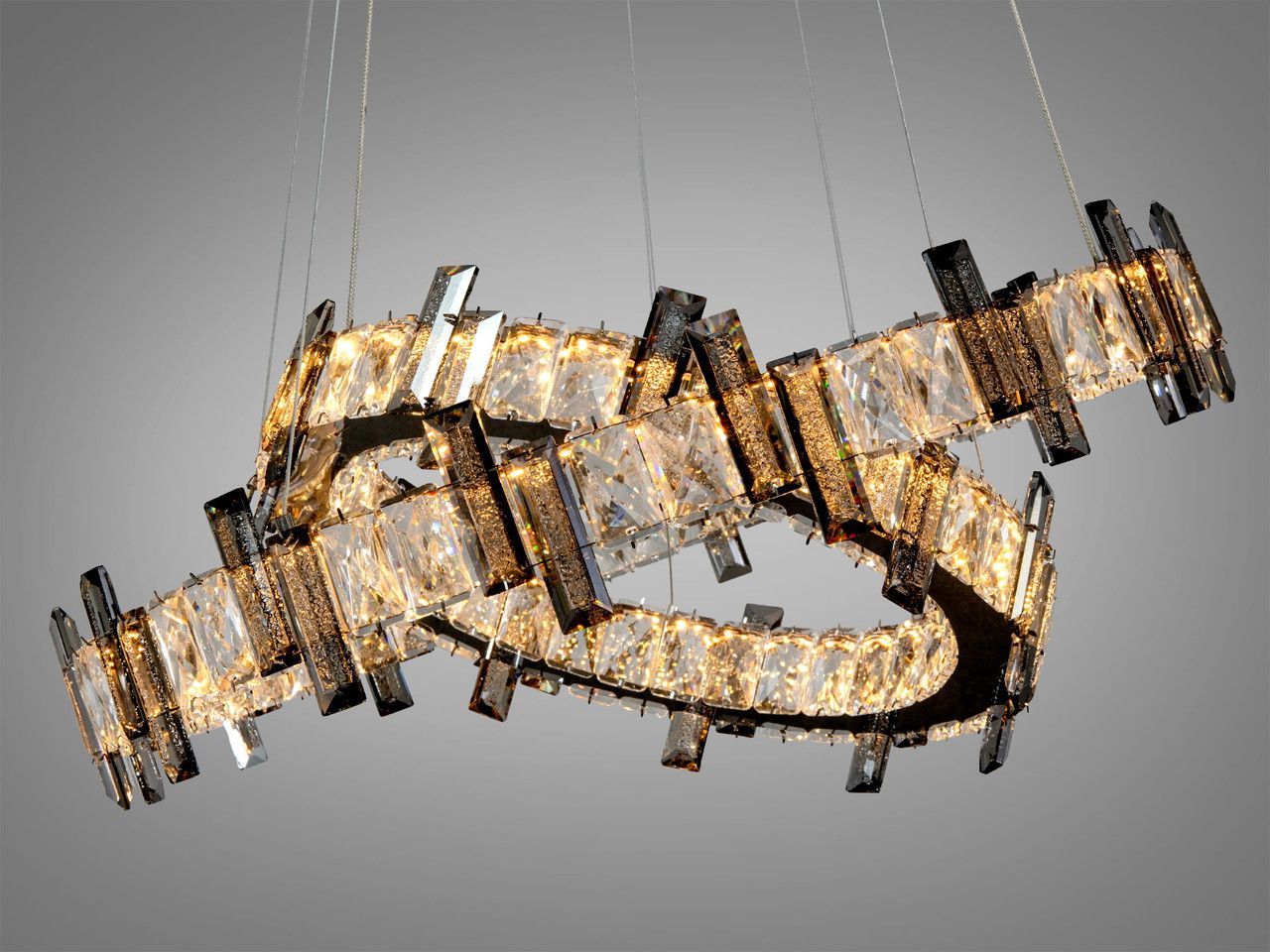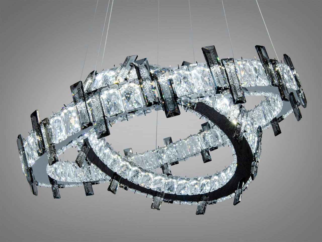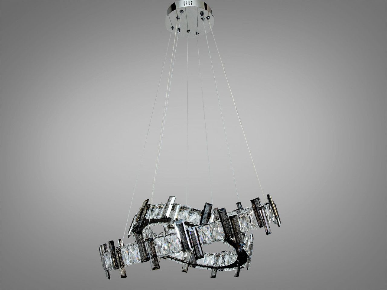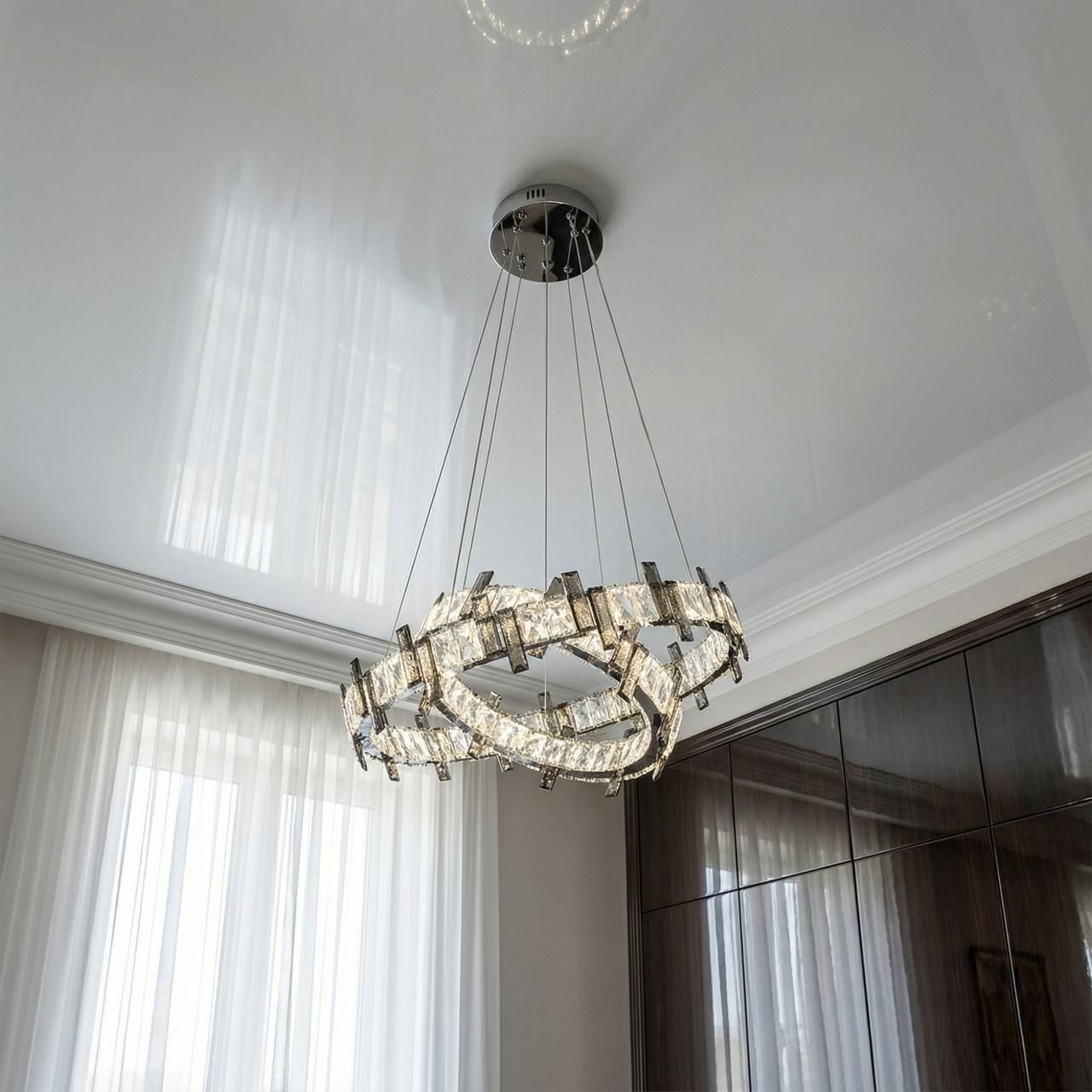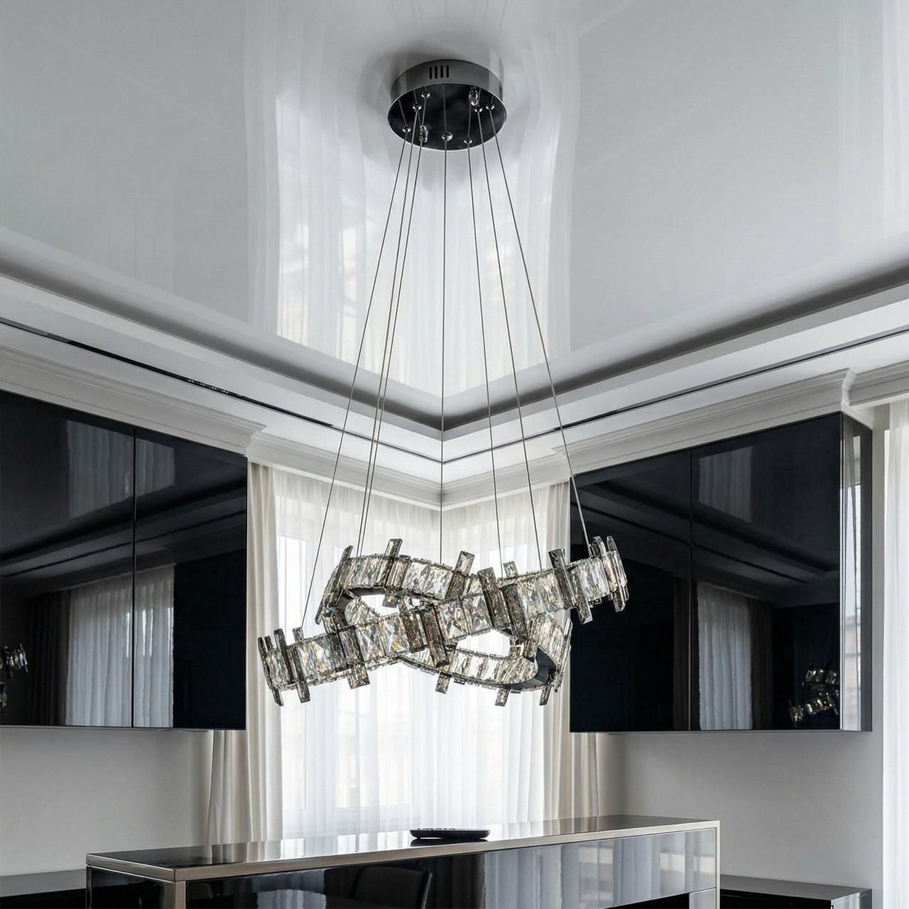 Визуальный образ люстры строится на архитектурности форм и безупречном блеске. Два независимых кольца (диаметрами 57 см и 40 см) выполнены из металла с высококачественным гальваническим покрытием «зеркальный хром». Внешний контур каждого яруса плотно украшен вертикальными кристаллами прямоугольной огранки. При включении встроенной светодиодной ленты лучи проходят сквозь грани хрусталя, создавая тысячи радужных бликов и наполняя комнату живым мерцанием, напоминающим сияние чистого льда.