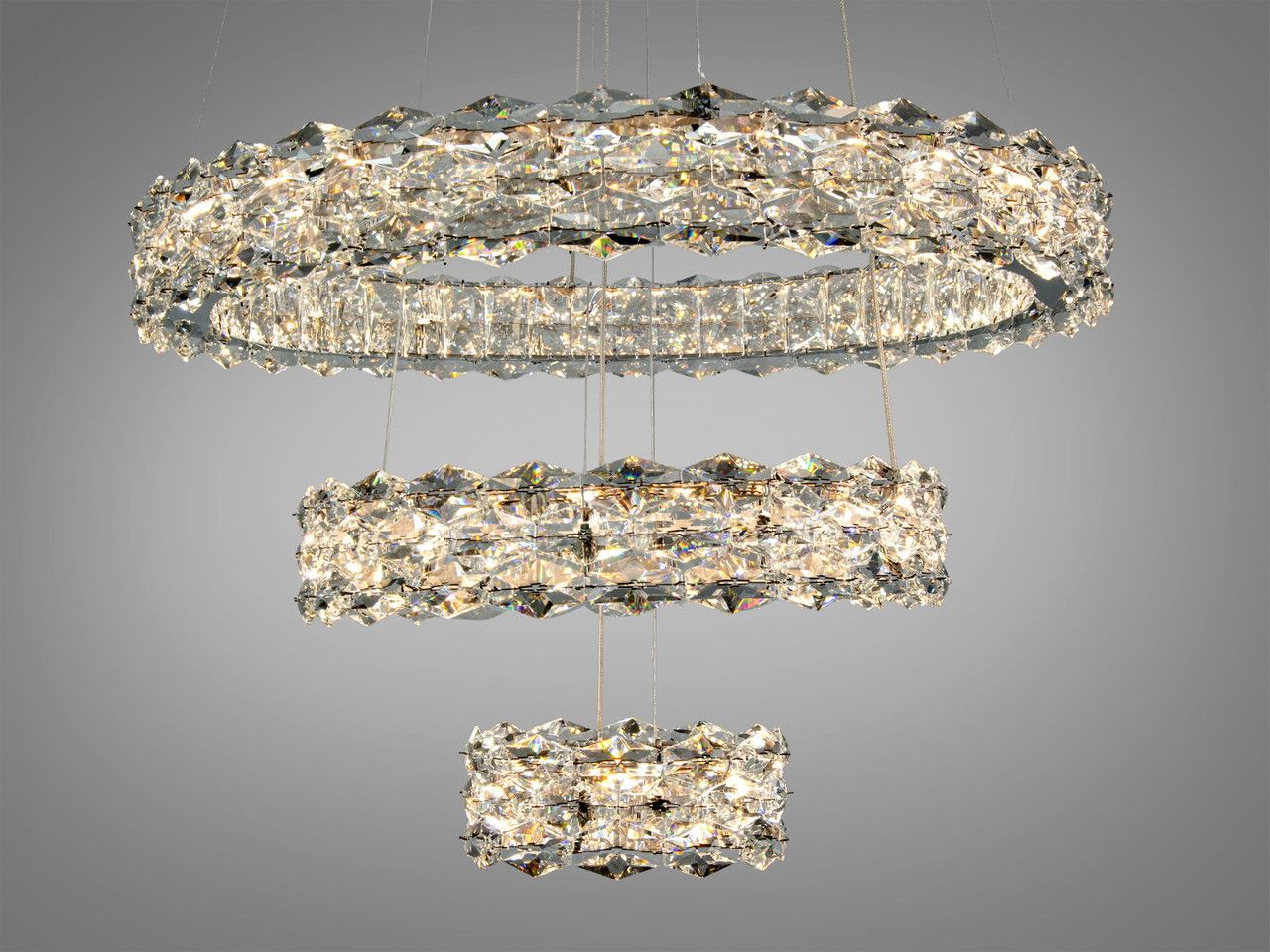 Визуальный образ люстры строится на эстетике холодного металла и безупречной игре света. Три независимых кольца расположены каскадом и выполнены из металла с высококачественным гальваническим покрытием цвета «зеркальный хром». Внешний контур каждого яруса (диаметрами 57 см, 40 см и 20 см) плотно украшен прозрачными кристаллами прямоугольной огранки. При включении встроенной светодиодной ленты лучи проходят сквозь грани хрусталя, создавая эффект бриллиантового сияния. Зеркальное хромированное основание дополнительно отражает свет, визуально увеличивая высоту потолка и объем помещения.
