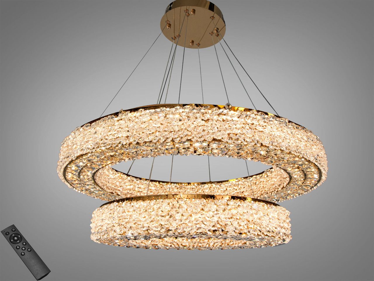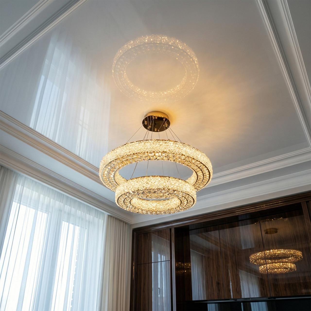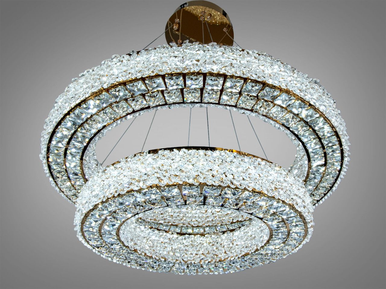 Визуальный образ люстры строится на симметрии и бриллиантовом сиянии. Два независимых круглых яруса выполнены из металла с высококачественным гальваническим покрытием цвета «зеркальный хром». Внешний контур каждого кольца (71 см и 50 см) плотно украшен высококачественным хрусталем, который при включении встроенной светодиодной ленты создает эффект непрерывного сияющего нимба. Лучи многократно преломляются в гранях кристаллов, наполняя комнату тысячами живых бликов и визуально расширяя границы помещения.