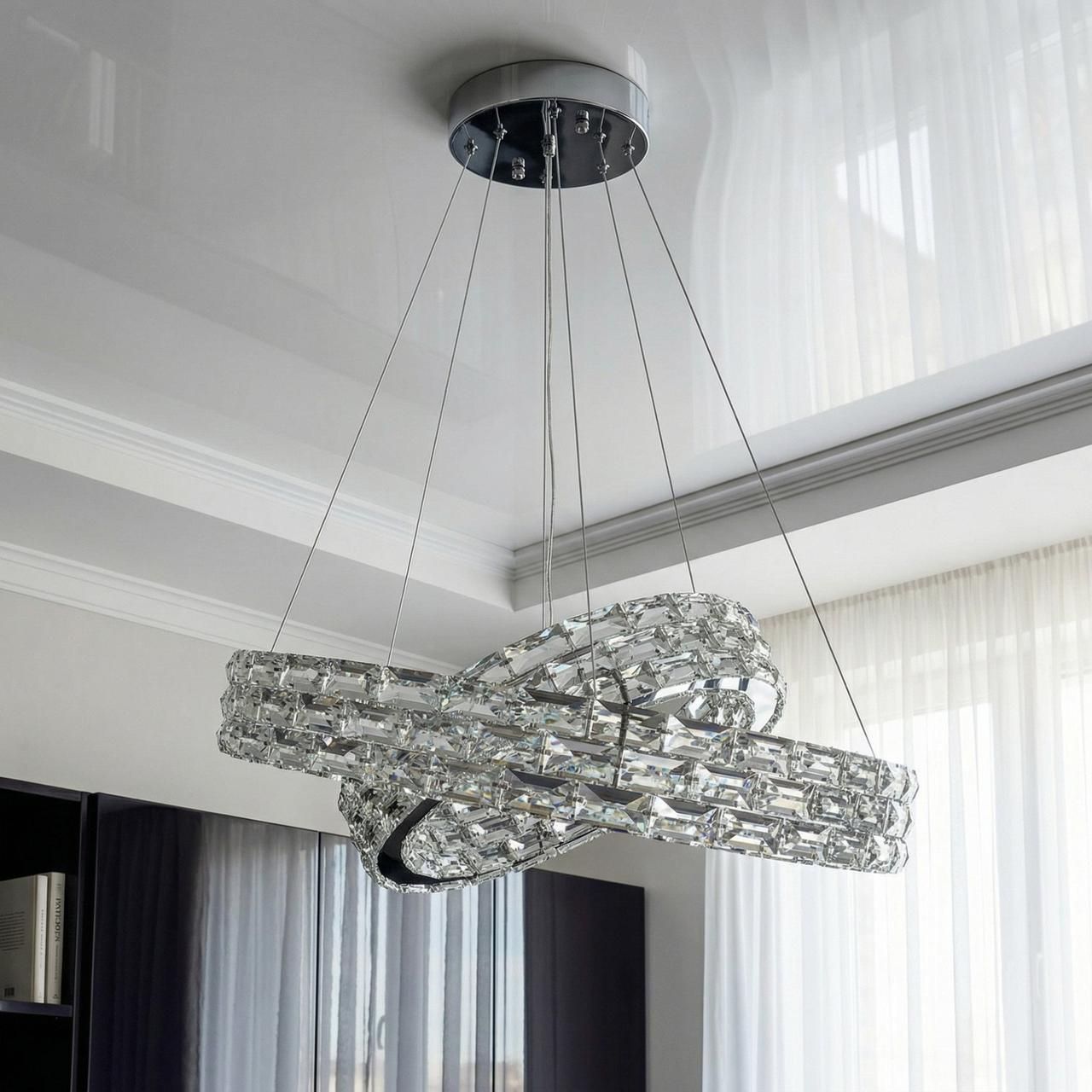 Визуальный образ люстры строится на эстетике плавных линий и бесконечной игры света. Два независимых кольца диаметром 60 см пересекаются друг с другом, образуя сложную объемную фигуру. Каркас выполнен из металла с высококачественным гальваническим покрытием «хром». Внешние грани колец плотно украшены прозрачными кристаллами прямоугольной огранки. При включении встроенной светодиодной ленты лучи многократно преломляются в гранях хрусталя, создавая эффект бриллиантового сияния и наполняя комнату живыми бликами.