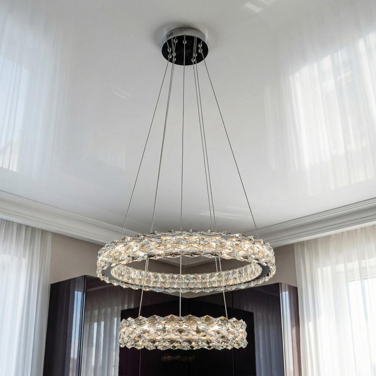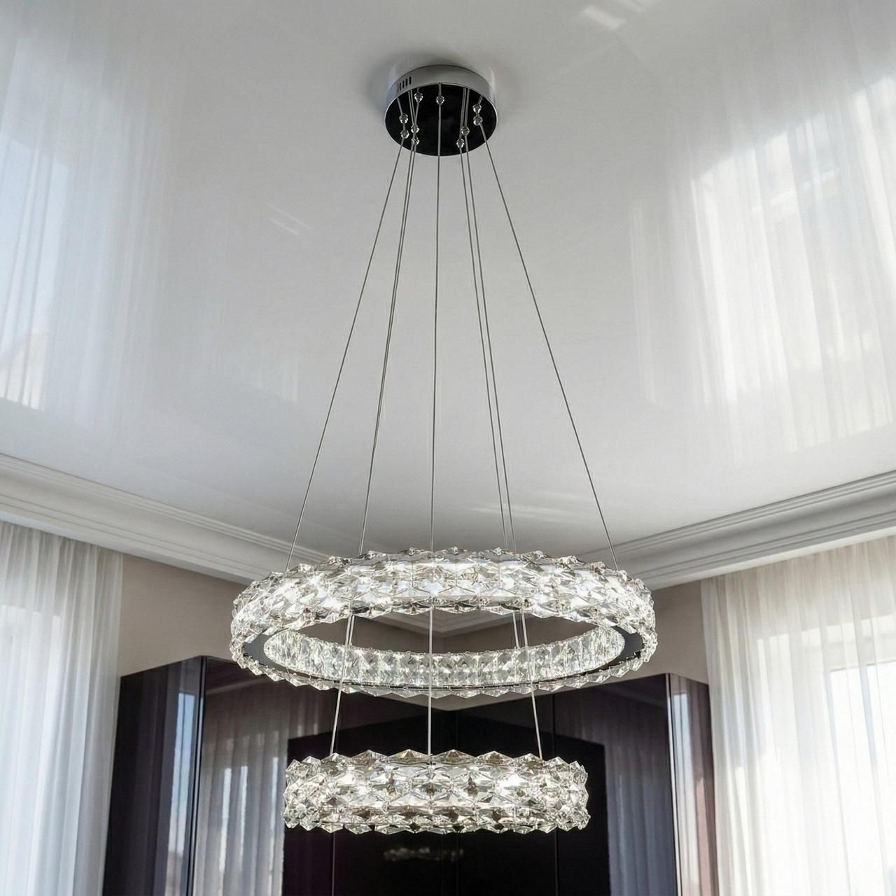 Визуальный образ люстры строится на архитектурности форм и безупречном блеске. Два независимых кольца (диаметрами 57 см и 40 см) выполнены из металла с высококачественным гальваническим покрытием цвета «зеркальный хром». Внешний контур каждого яруса плотно украшен вертикальными кристаллами прямоугольной огранки. При включении встроенной светодиодной ленты лучи проходят сквозь грани хрусталя, создавая тысячи радужных бликов и наполняя комнату живым мерцанием, напоминающим сияние чистого льда.