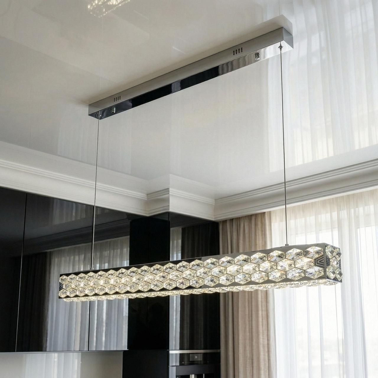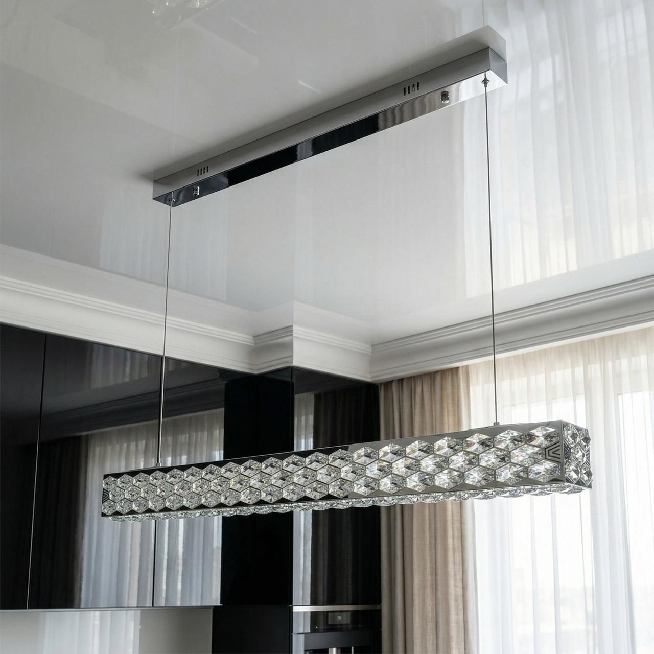 Визуальный образ люстры строится на гармонии строгой геометрии и «ледяного» сияния. Узкий металлический каркас покрыт высококачественной хромированной гальваникой с безупречным зеркальным блеском. По всему периметру штанги закреплены плотные ряды хрустальных элементов, которые создают объемную сверкающую фактуру. При включении встроенной светодиодной ленты свет проходит сквозь тысячи граней хрусталя, создавая эффект ослепительного сияния и наполняя комнату живыми бликами, визуально расширяя границы пространства.